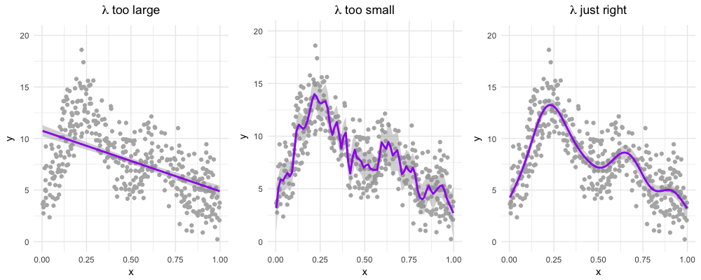 평활 파라미터 람다가 너무 큰 경우 적합선은 곡선모양의 데이터를 가로지르는 직선이 되고(왼쪽 그림) 너무 적은 경우 트렌드(trend)가 아닌 소음(noise)에 반응하여 과적합된다(가운데 그림). 가장 적절한 람다의 값은 과적합과 과소적합 사이의 균형을 잡아준다.