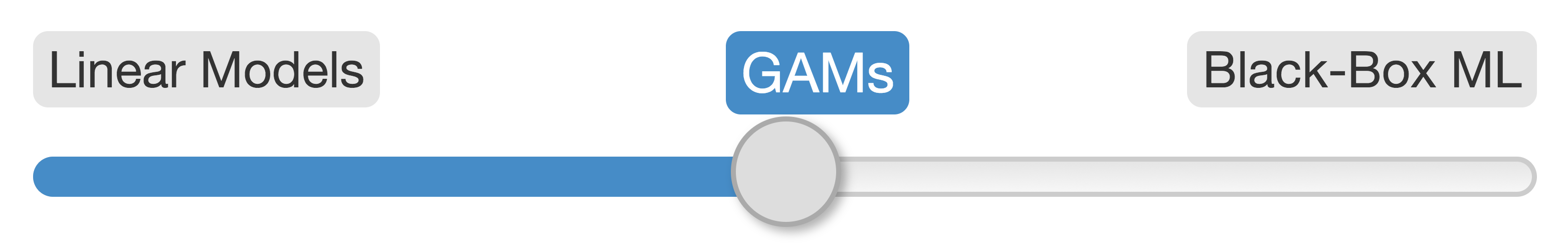 선형회귀와 같은 단순한 모형은 사용하기 쉽고 해석하기 쉬우며 인수의 뜻도 해석하기 쉽다. 하지만 선형관계로 설명할 수 없는 현상을 설명하려면 보다 복잡한 모형이 필요하다. 신경망과 같은 기계학습 모형은 복잡한 관계를 예측하는 능력은 뛰어나지만 많은 데이터를 필요로 하고 해석하기 어렵고 모형의 결과로부터 추론하는 것이 매우 어렵다. GAM은 선형모형과 기계학습의 중간에 위치하고 있다. 복잡한 비선형관계를 적합시킬 수 있으며 매우 좋은 예측을 할 수 있는 반면 통계적 추론이 가능할 뿐만 아니라 모형의 구조를 이해하고 설명할 수 있으며 예측에 대한 설명도 가능하다.