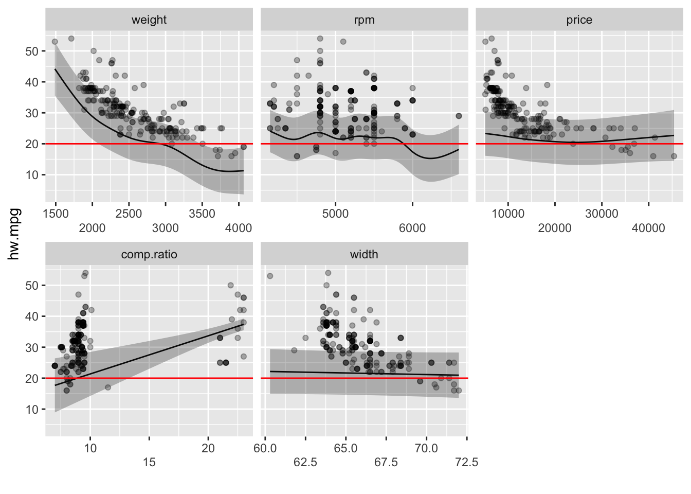 m <- gam(hw.mpg ~ s(weight) + s(rpm) + s(price) + s(comp.ratio) + s(width) + fuel,