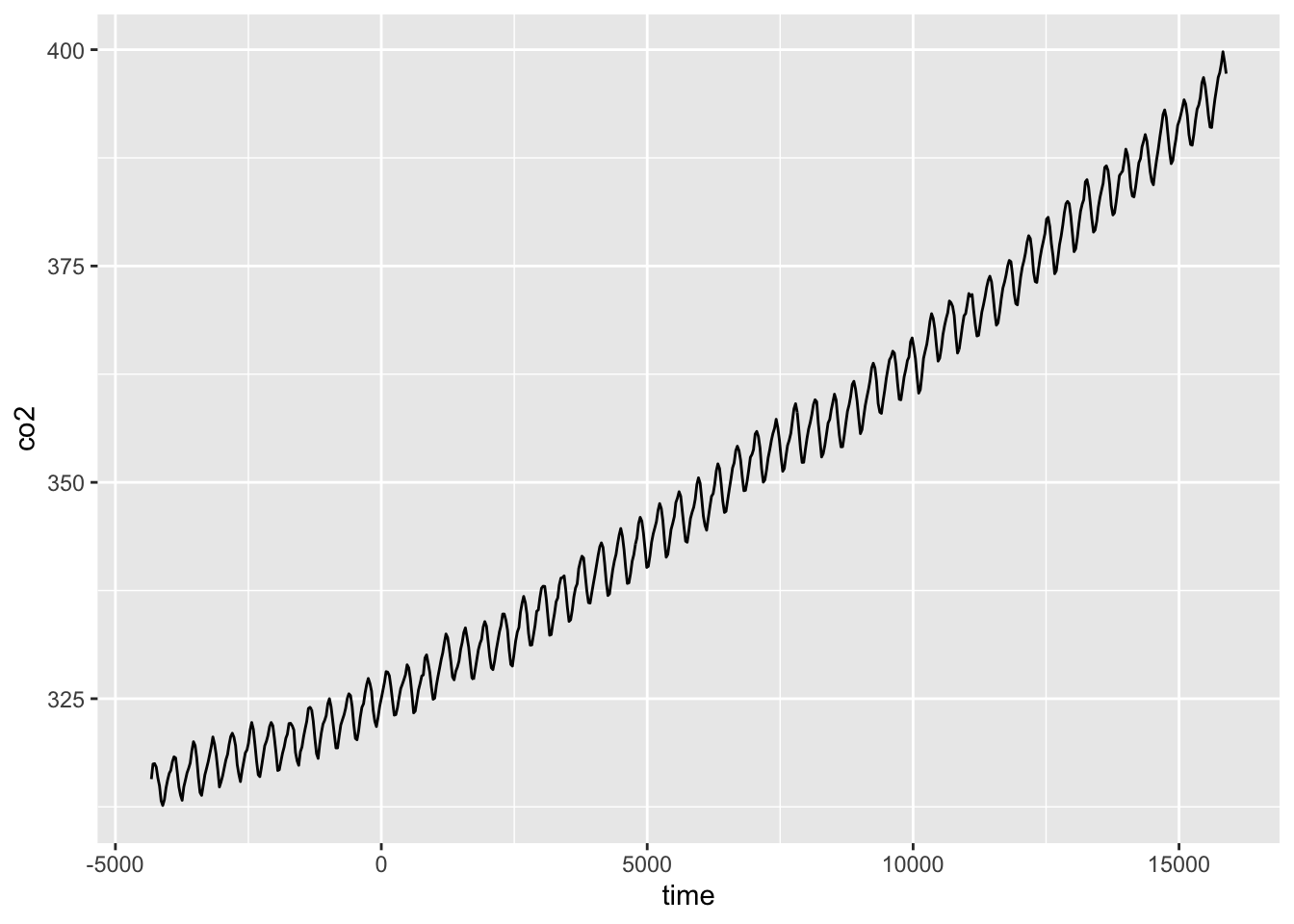 ggplot(co2,aes(x=time,y=co2))+geom_line()