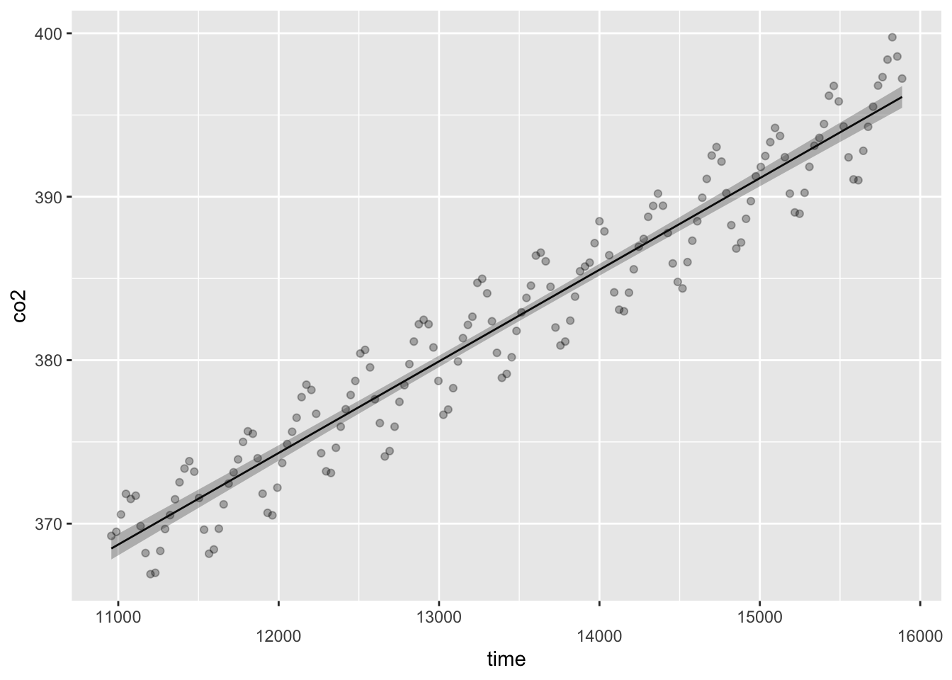 1958년 부터 2013년 까지의 자료중 일단 추세를 보기 위해 2000년 이후의 자료를 분석해본다. 2000년 이후의 자료를 co2df라는 이름으로 저장하고 시간의 흐름에 따른 이산화탄소 농도의 변화를 보기 위해 co2농도를 반응변수로 time을 설명변수로 하여 gam에 적합시킨다.