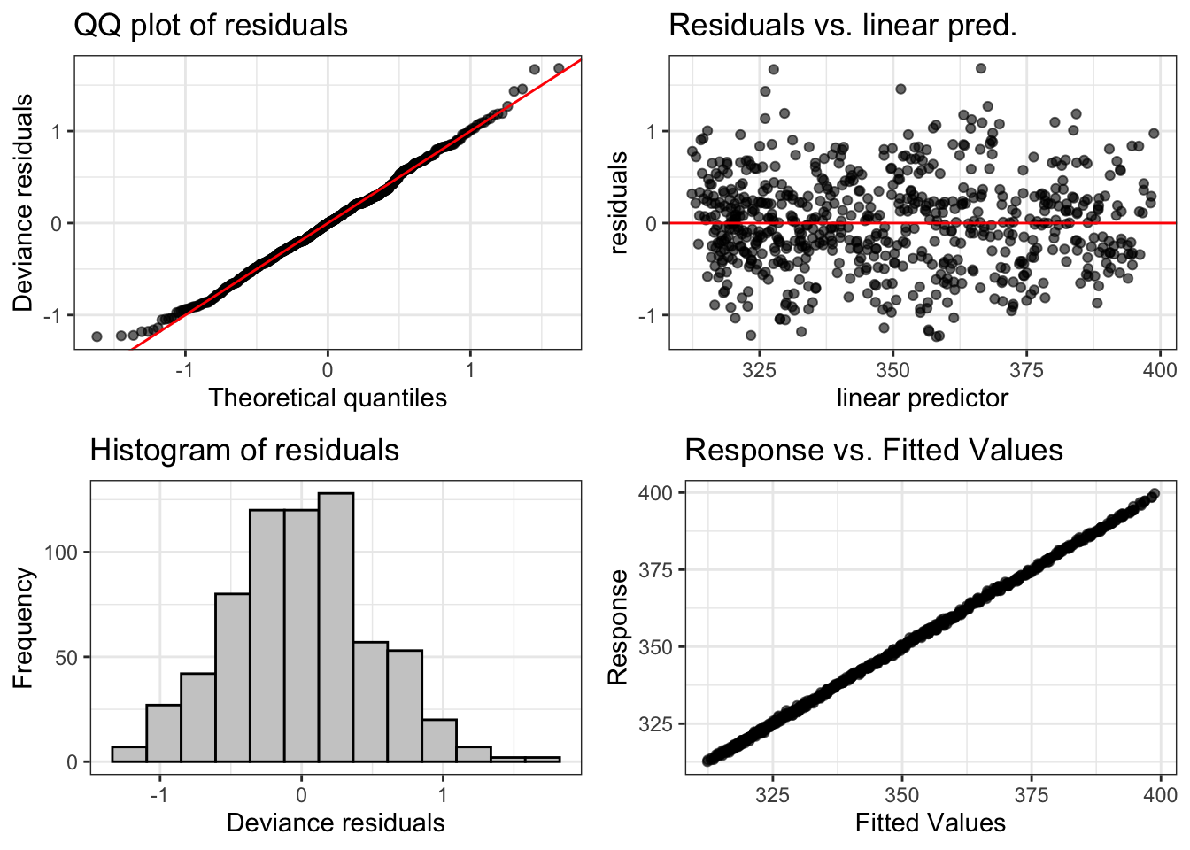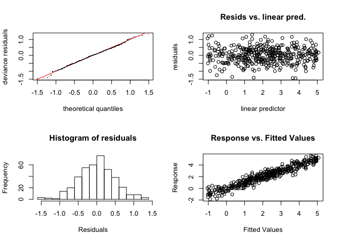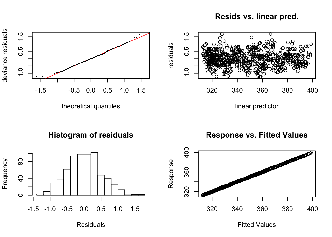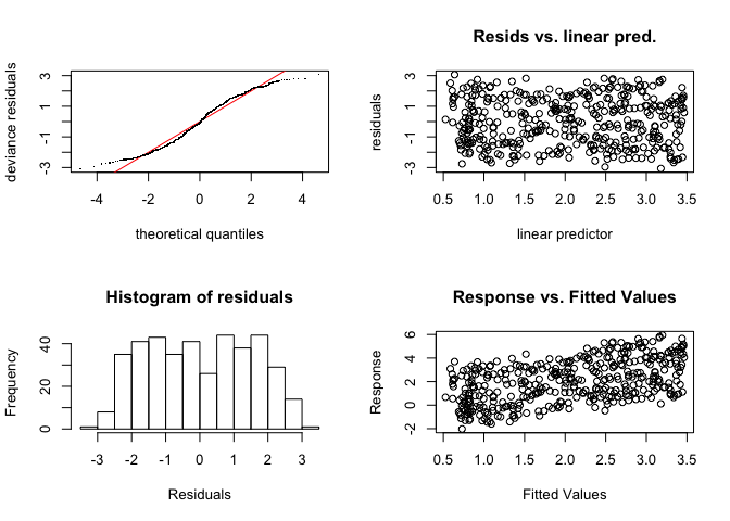 gam.check()함수는 네 개의 plot을 만들어 주는데 이들은 모형의 잔차를 각기 다른 방법으로 보여준다. 아래의 그림은 제대로 적합되지 않은 모형의 diagnostic plot을 보여준다. 왼쪽 위 그림은 Q-Q plot으로 모형의 잔차를 정규분포와 비교해준다. 잘 적합된 모형의 경우 잔차는 직선에 매우 근접한다. 아래 왼쪽은 잔차의 히스토그램으로 잘 적합된 모형의 경우 대칭적인 벨 형태를 기대할 수 있다. 오른쪽 위의 그림은 잔차의 그림으로 0 주위에서 고르게 분포하여야 한다. 마지막으로 오른쪽 아래 그림은 반응변수와 적합된 값을 나타낸 것으로 완벽한 모형인 경우 직선을 형성한다. 우리는 완벽한 모형을 기대하지는 않지만 (0,0)과 (1,1)을 지나는 직선 주위에 모여 있는 양상을 기대한다.