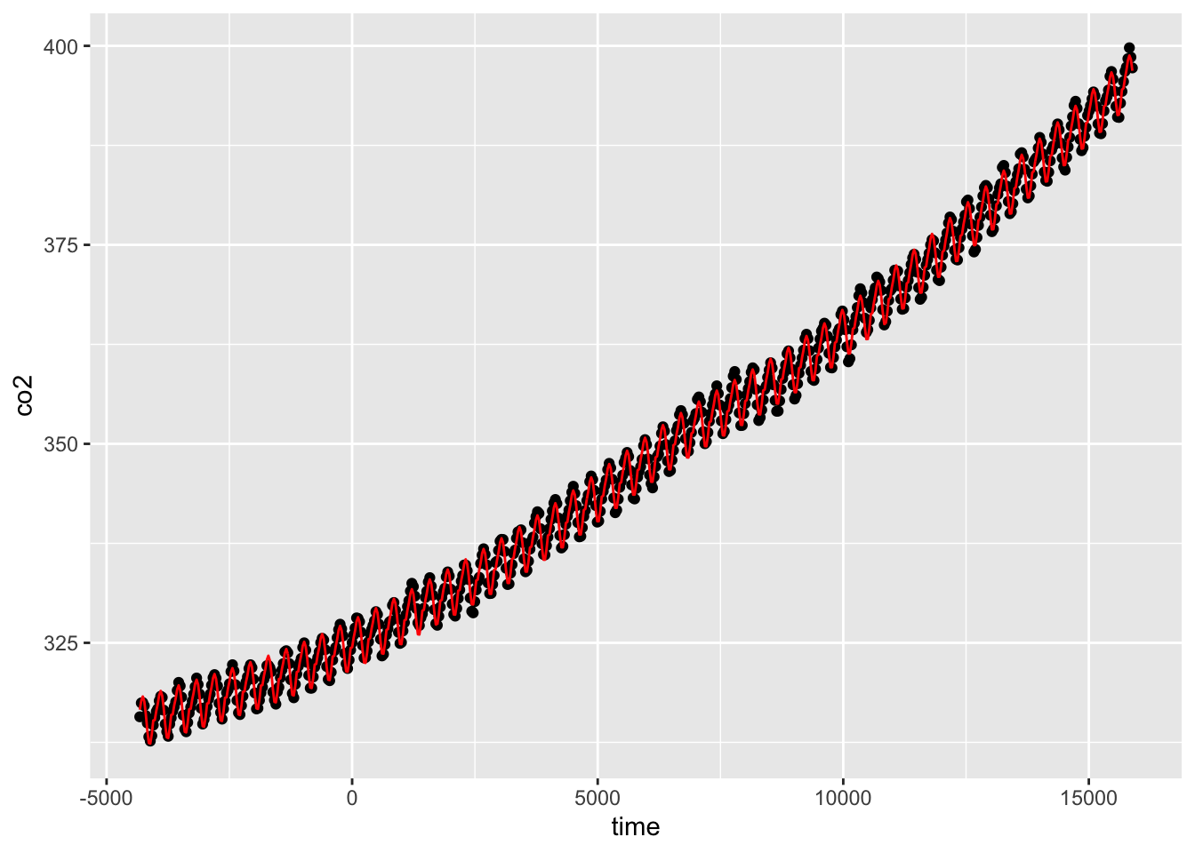 co2 ~ s(month, bs = "cc", k = 12) + s(time)