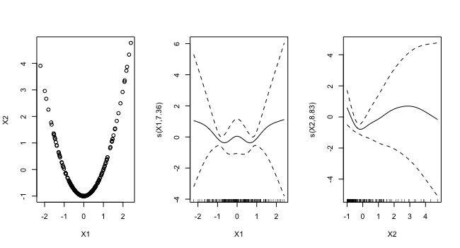 GAM에서는 공선성 이외에도 또 하나의 잠재적인 함정이 있다. 두 개의 변수의 상관관계가 높지 않더라도 두개의 변수의 관계가 곡선 관계인 concurvity를 보일 수 있다. 위의 그림에서 두개의 변수 X1과 X2는 선형관계는 아니지만 완벽한 포물선을 그리기 때문에 이 두개의 변수 X1과 X2를 같은 모형에 예측변수로 사용하는 경우 가운데와 오른쪽 그림과 같은 신뢰구간이 매우 넓은 평활곡선을 얻게 된다.