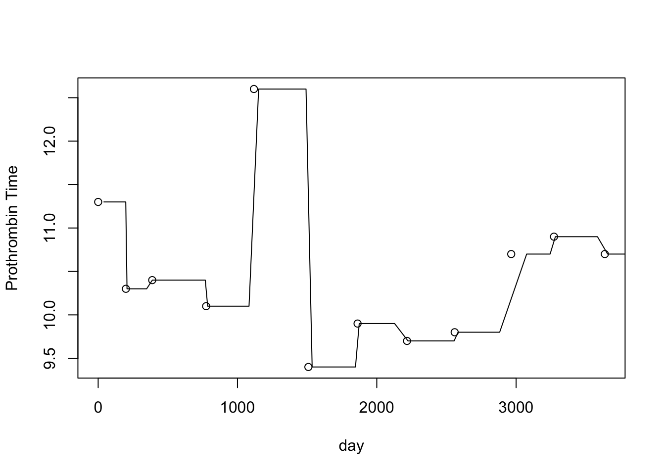 plot(er$day,er$protime,xlab="day",ylab="Prothrombin Time")