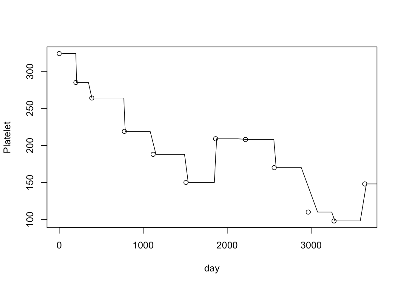 plot(er$day,er$platelet,xlab="day",ylab="Platelet")