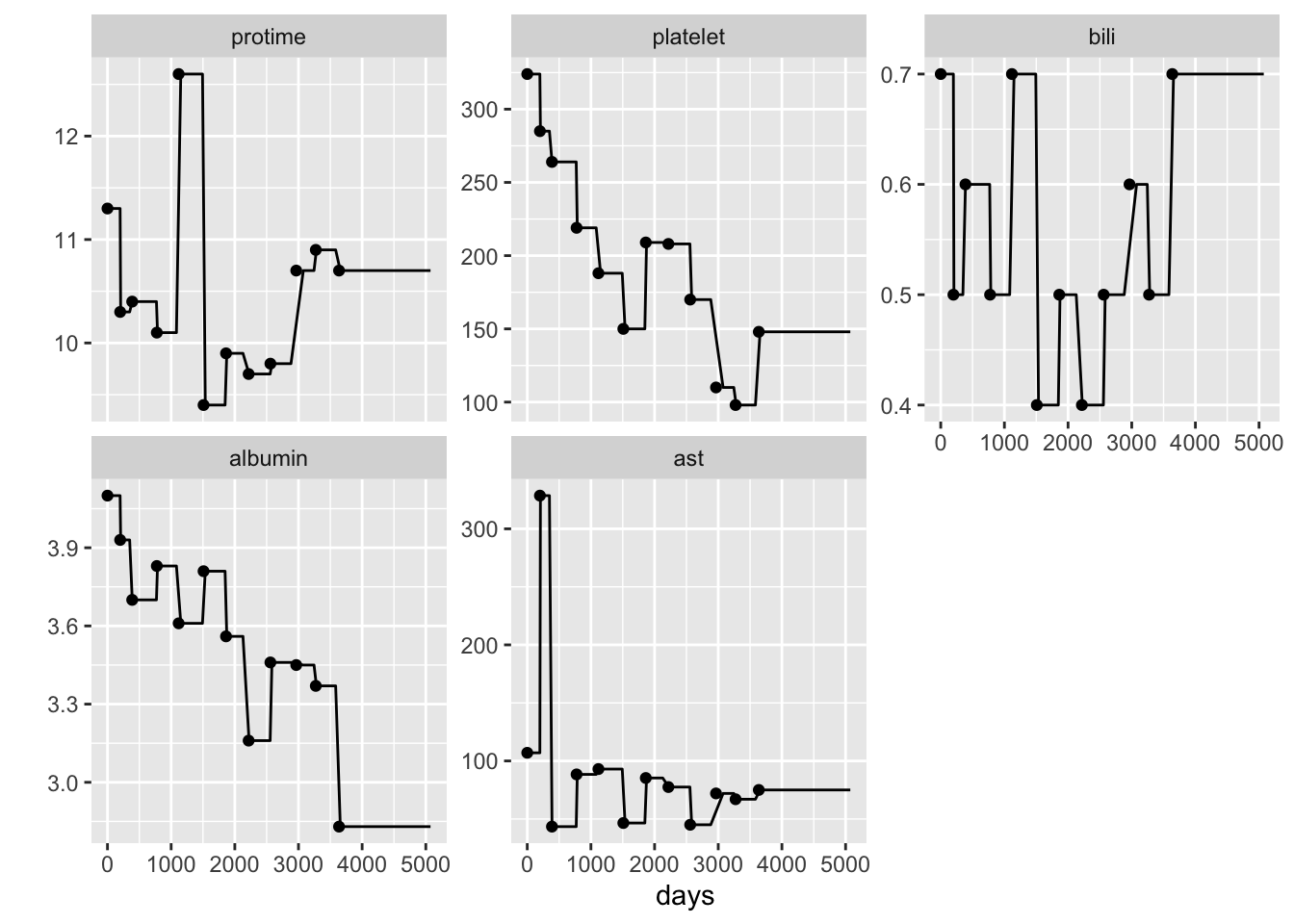 또한 생존과 관련된 다른 공변량의 변화 또한 관심이 있다. 다음 코드로 시간에 따른 공변량의 변화를 시각화할 수 있다. 다음은 25번째 환자의 시간에 따른 protime과 platelet의 변화이다.