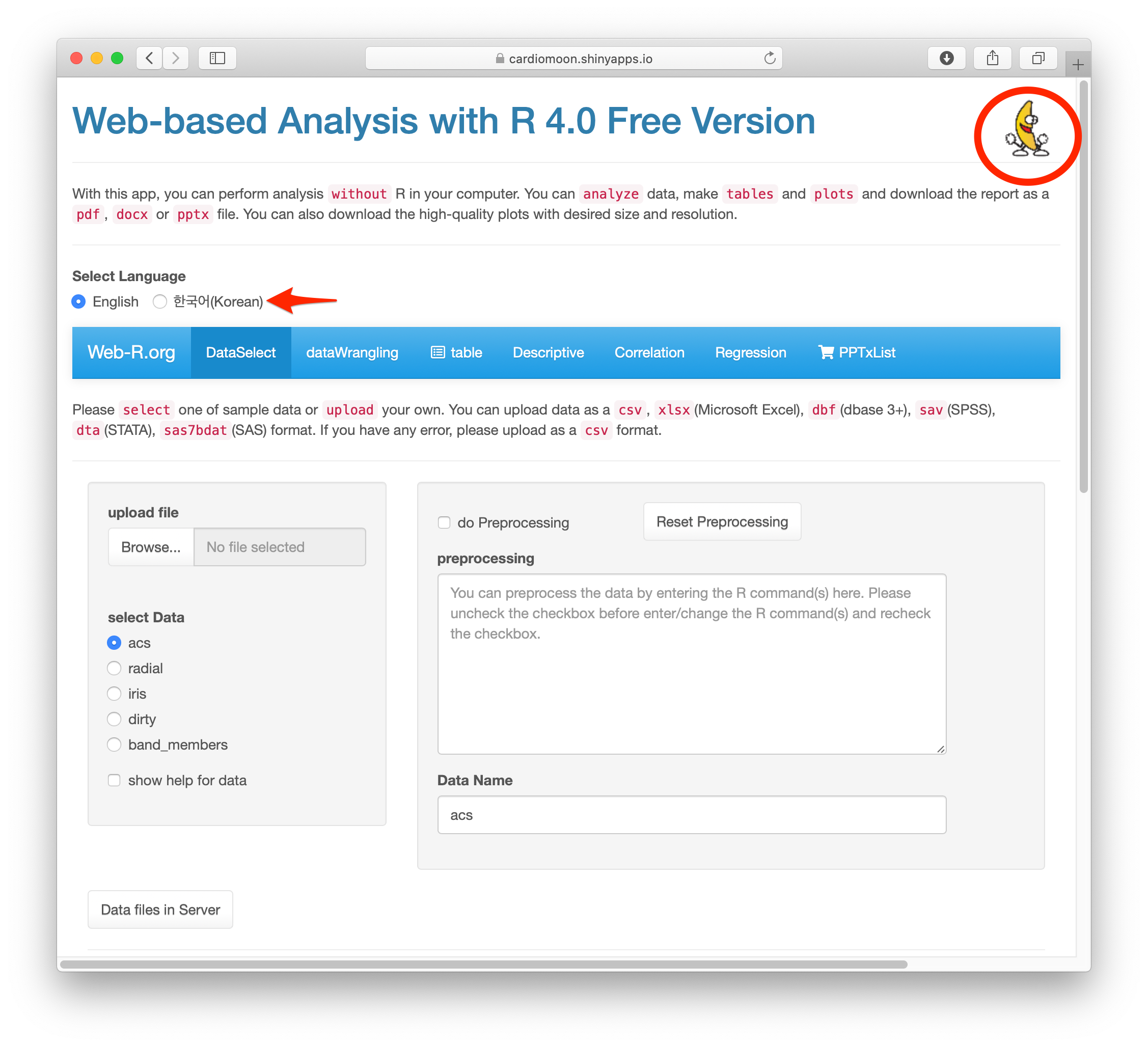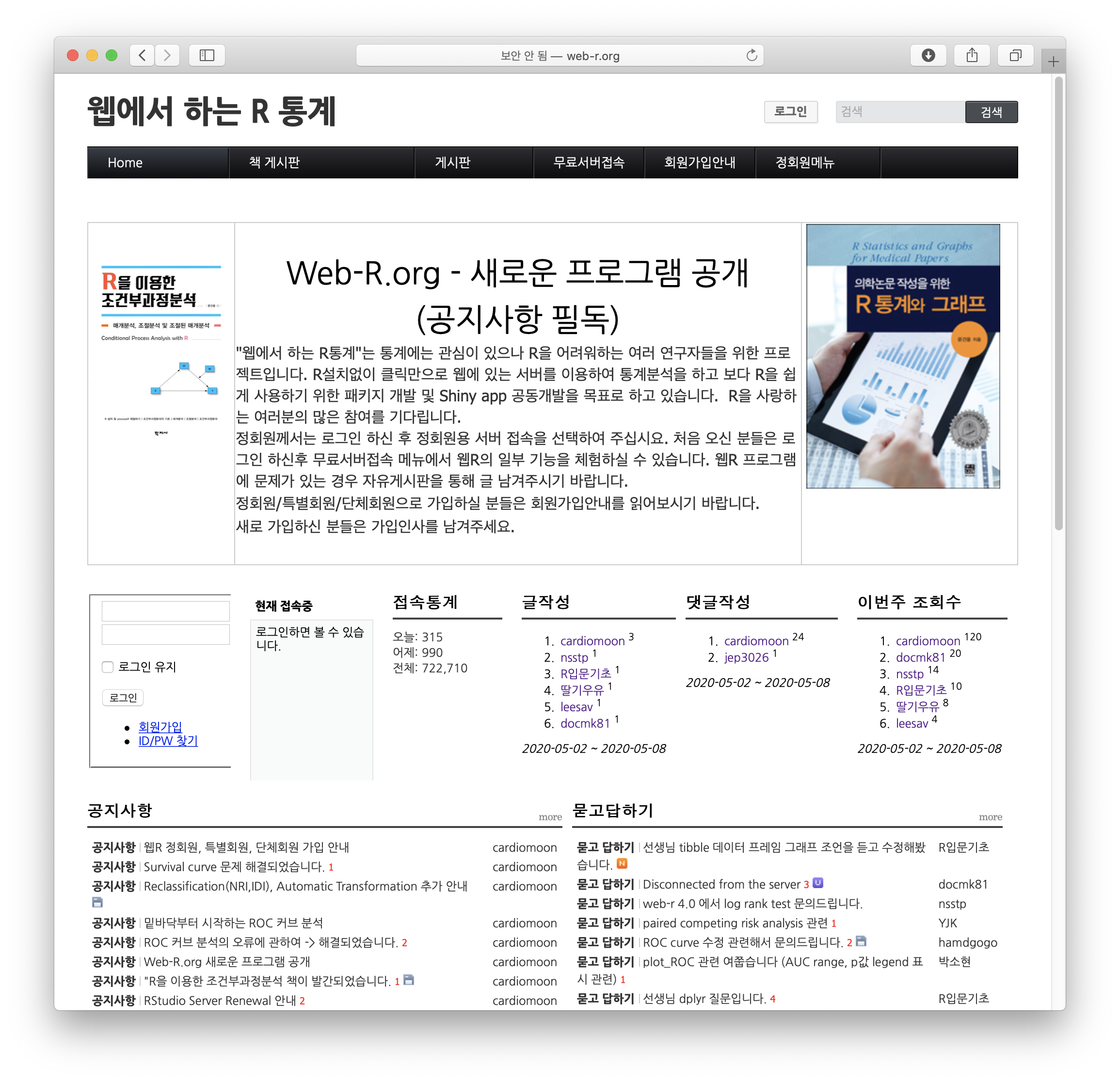 인터넷 브라우져를 통해 웹에서 하는 R 통계분석(web-r.org)에 접속한다. 웹에서 하는 R통계분석은 R 과 shiny를 이용하여 만든 shiny app으로 이를 이용하기 위해서는 HTML5를 지원하는 웹브라우져가 필요하다. 구글 chrome이나 safari 등의 웹브라우져를 이용하여 접속할 것을 권장한다. 인터넷 익스플로러에서는 테스트해보지 않아 제대로 동작하는지 보장하지 못한다.