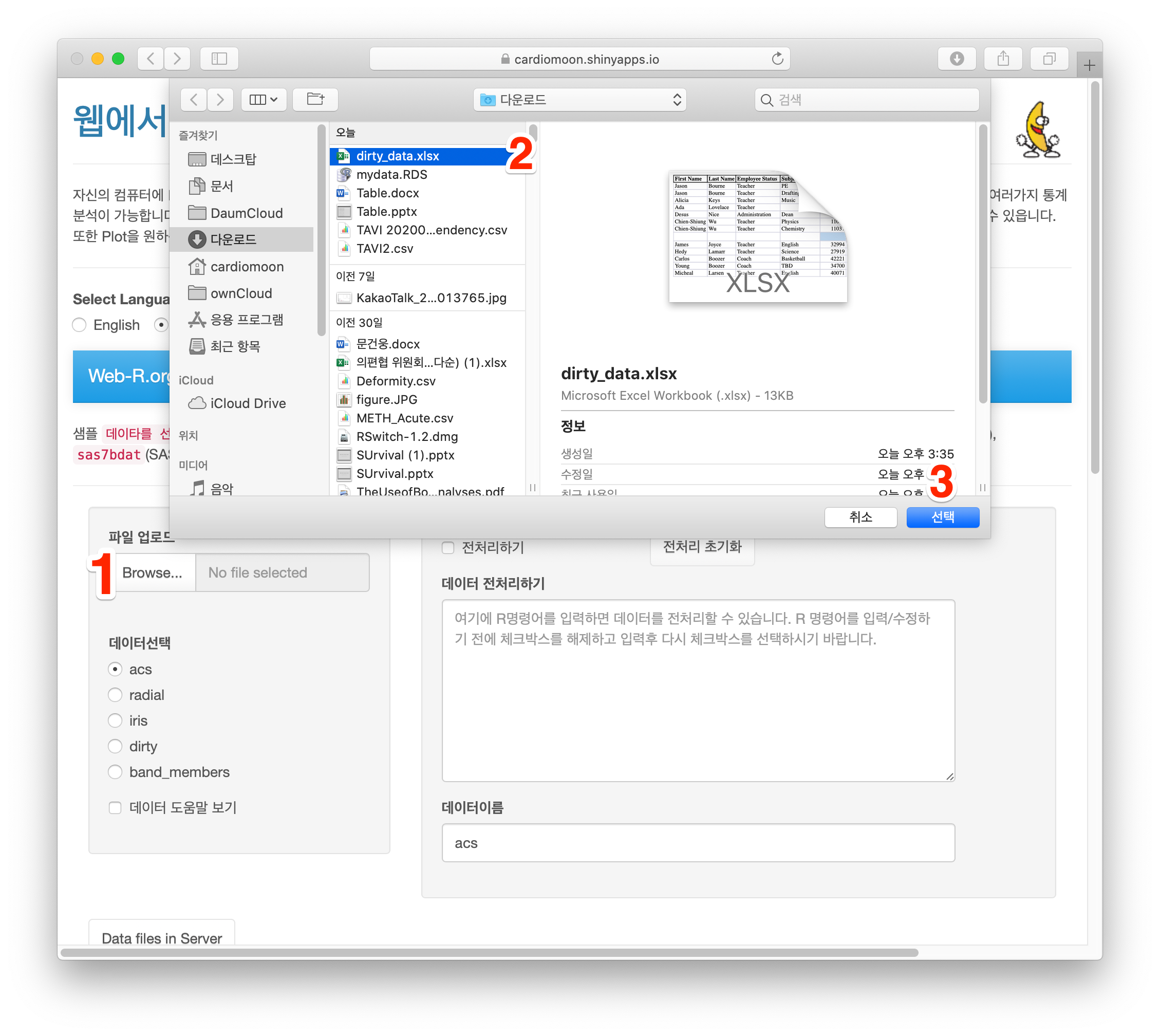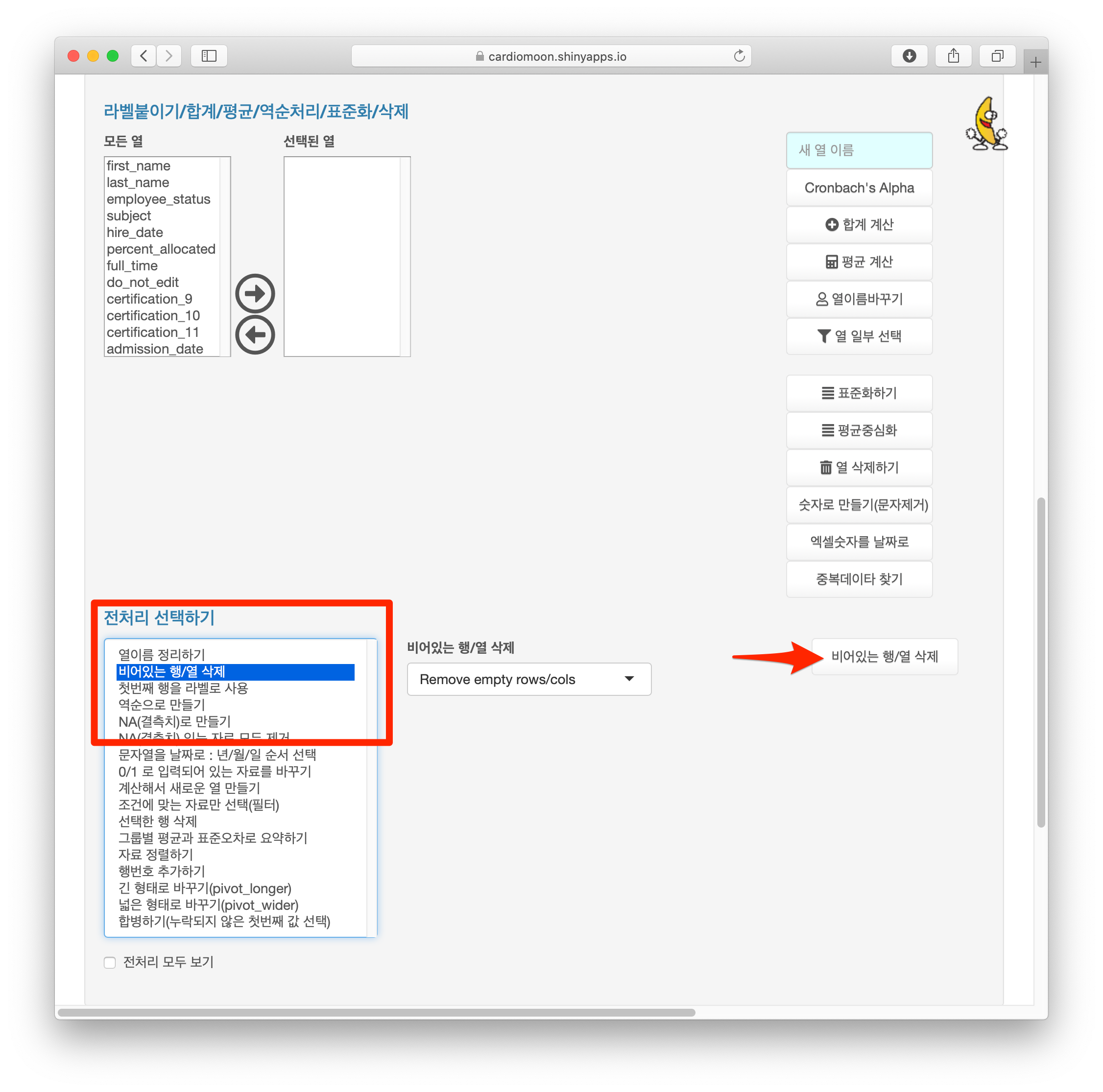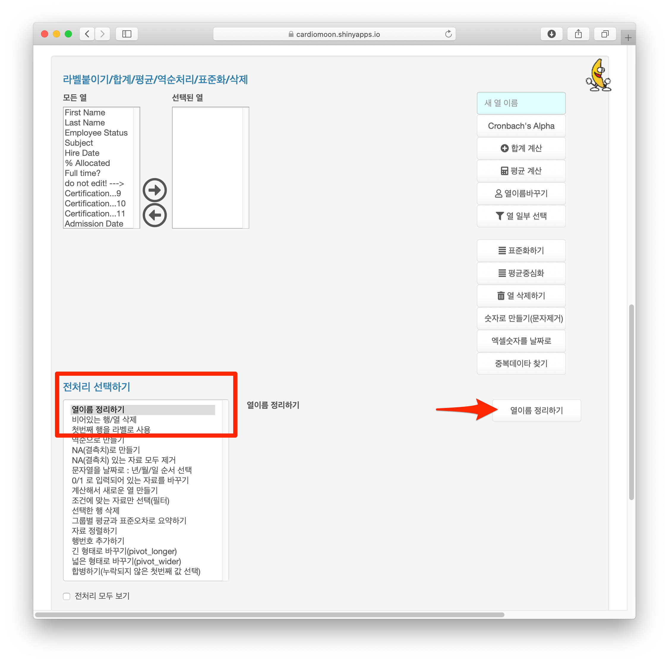 화면을 아래로 이동하여 전처리선택하기에서 “열이름 정리하기”가 선택되어 있는 것을 확인하고 열이름정리하기 버튼을 누른다. R에서는 열이름에 공백문자를 사용할 수 없고 특수문자도 사용할 수 없다. 열이름정리하기 는 열 이름을 R에서 사용할 수 있도록 바꾸어 준다.