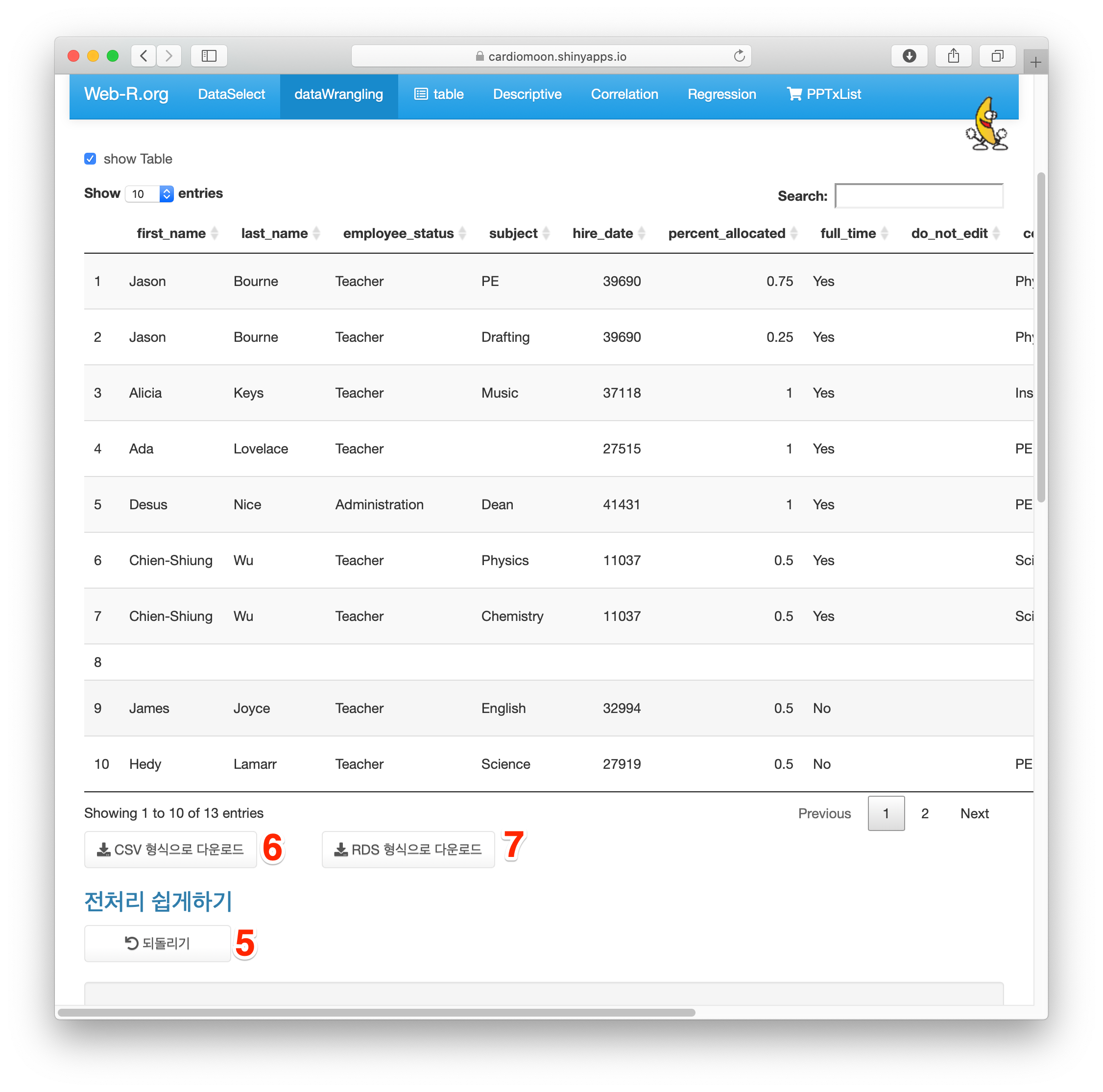 전처리 도중 전처리를 잘못한 경우를 대비하여 되돌리기 버튼(5)이 있는데 이 버튼을 누르면 바로 전의 상태로 되돌아간다. 또한 전처리가 끝난 데이터를 csv형식으로 다운로드(6) 받거나 RDS형식으로 다운로드(7) 받을 수 있는데 여러가지 이유에서 RDS형식으로 다운로드 받을 것을 권한다.