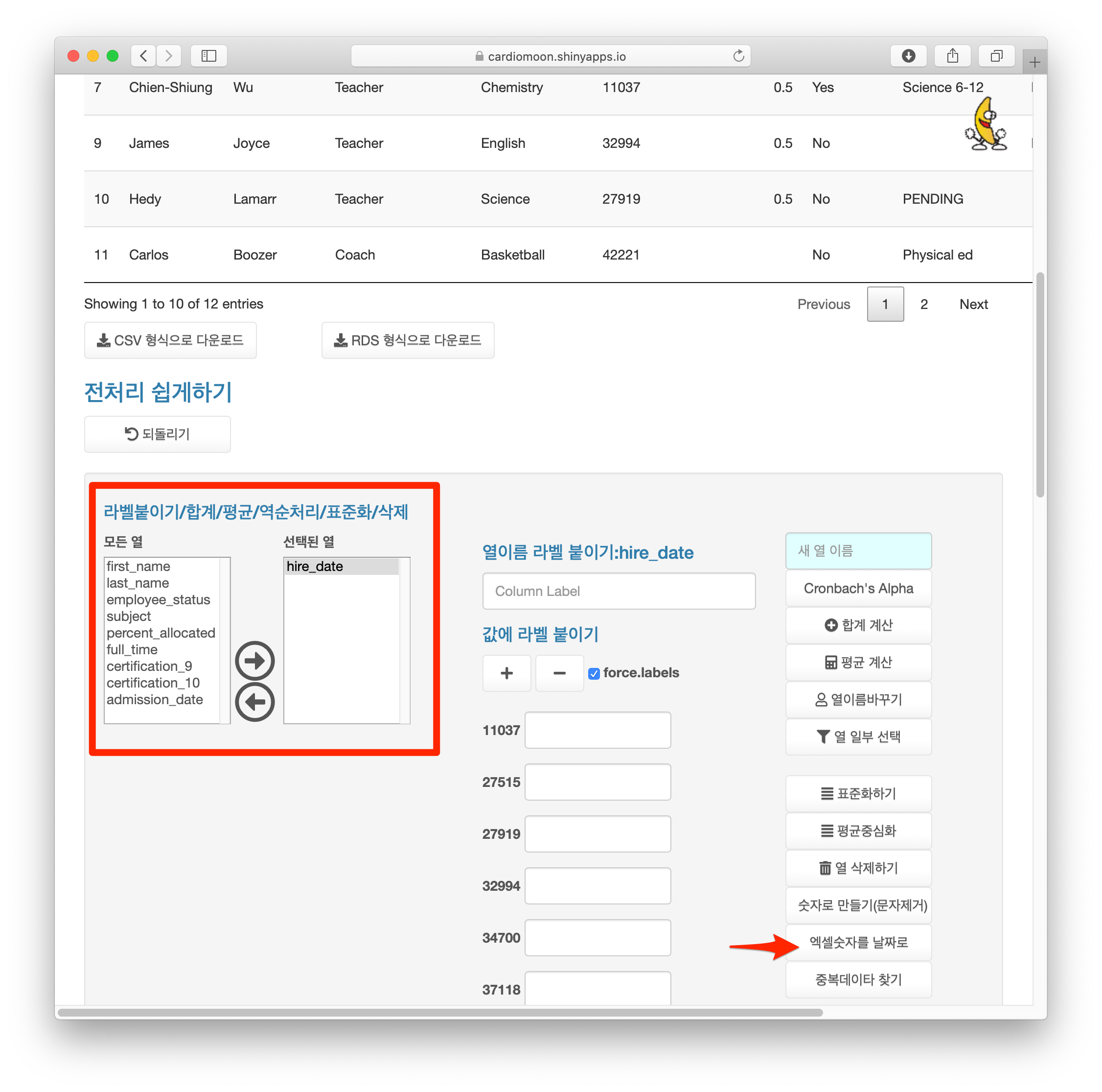 엑셀에서 날짜를 입력한 경우 R로 불러오면 숫자로 변환되어 있는 경우가 있다. 이 데이터의 경우 hire_date가 숫자로 변환되어 있는데 이를 날짜로 바꾸려면 먼저 모든 열에서 hire_date 열을 선택하여 오른쪽으로 옮긴후 “엑셀숫자를 날짜로” 버튼을 누르면 된다.