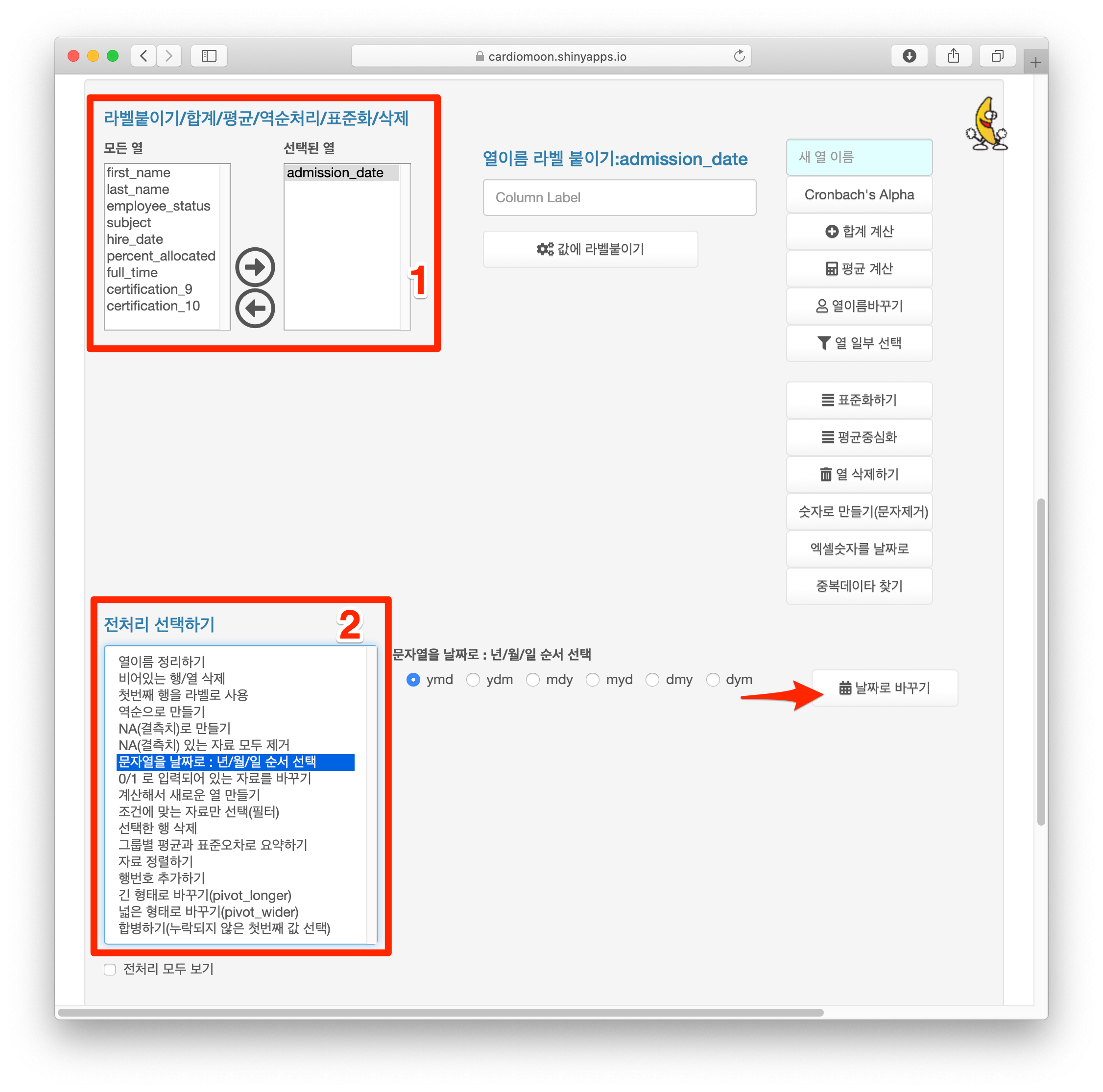 위의 데이터 중 admission_date는 문자로 변환되어 있다. 이를 날짜로 바꾸려면 먼저 admission_date를 선택한 후(1) 전처리 선택하기에서 “문자열을 날짜로” 를 선택한 후(2) “날짜로 바꾸기” 버튼을 누른다(화살표).