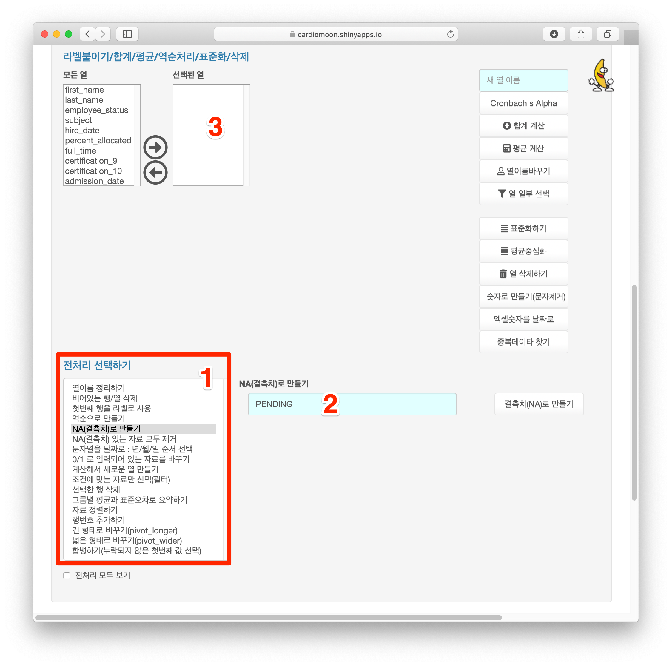 경우에 따라 데이터가 누락되어 있는 경우 99, 999, NA등으로 표시하는 경우가 있다. 이 데이터에서 PENDING으로 표시되어 있는 것을 결측치로 만들려면 “NA(결측치)로 만들기”를 선택한 후(1) PENDING을 입력하고(2) “결측치(NA)로 만들기” 버튼을 누른다(화살표). 이 때 선택된 열(들)이 있는 경우 그 열(들)만 결측치 만들기가 진행되며 선택된 열이 없는 경우(3) 모든 열에 대해 변환이 진행된다.