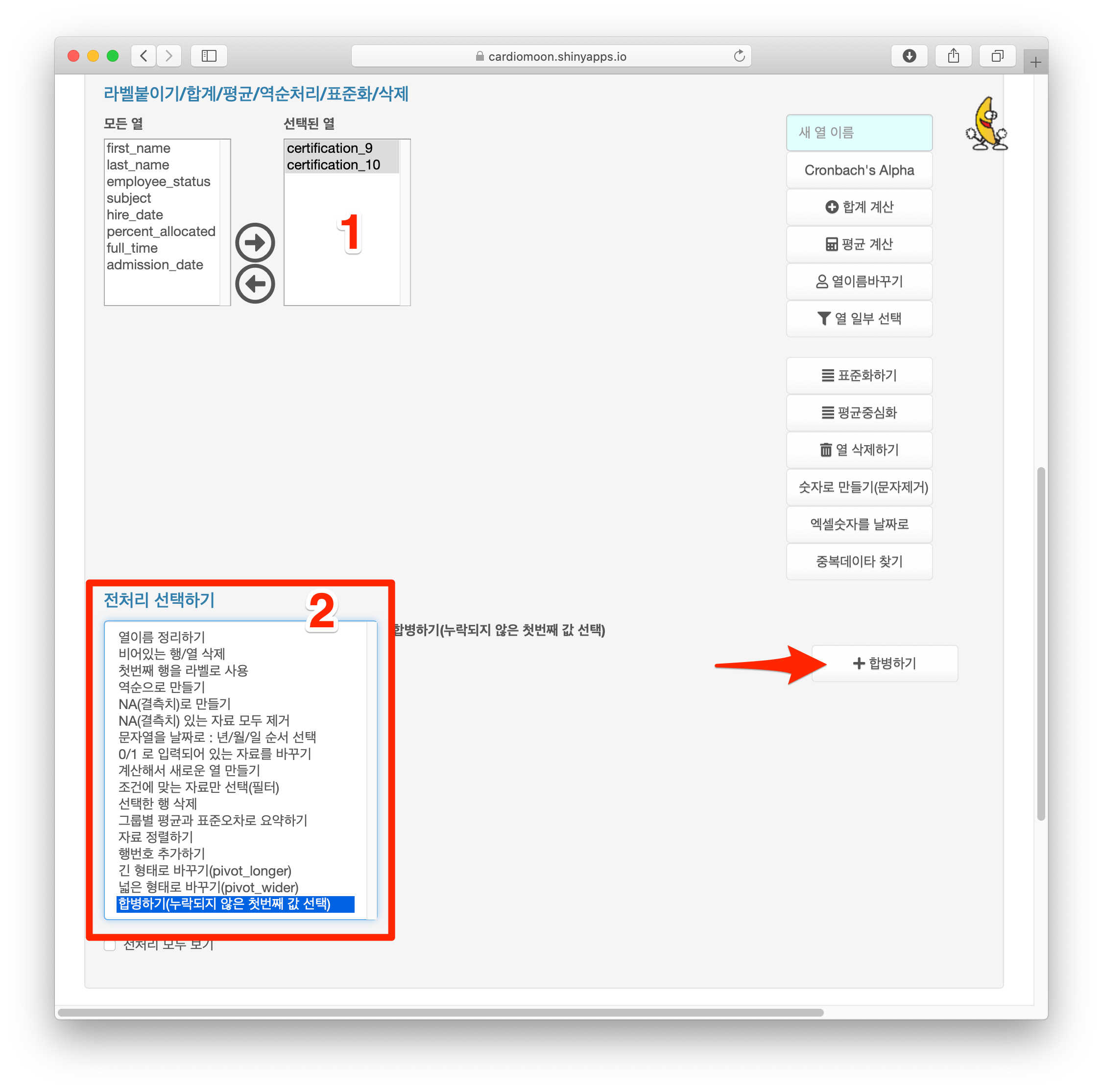경우에 따라 두 개의 열에 있는 데이터를 병합하여 새로운 열을 만들어야 할 때가 있다. 이 데이터에서 certification_9와 certification_10에 있는 데이터 중 누락되지 않은 첫번째 값을 선택하려면 먼저 certification_9와 certification_10 두 개의 열을 선택하고(1) 전처리 선택하기 중 합병하기를 선택한 후(2) 합병하기 버튼을 누른다(화살표). 데이터의 마지막에 certification_All이라는 열에 두 개의 열이 합병되어 나타난다.