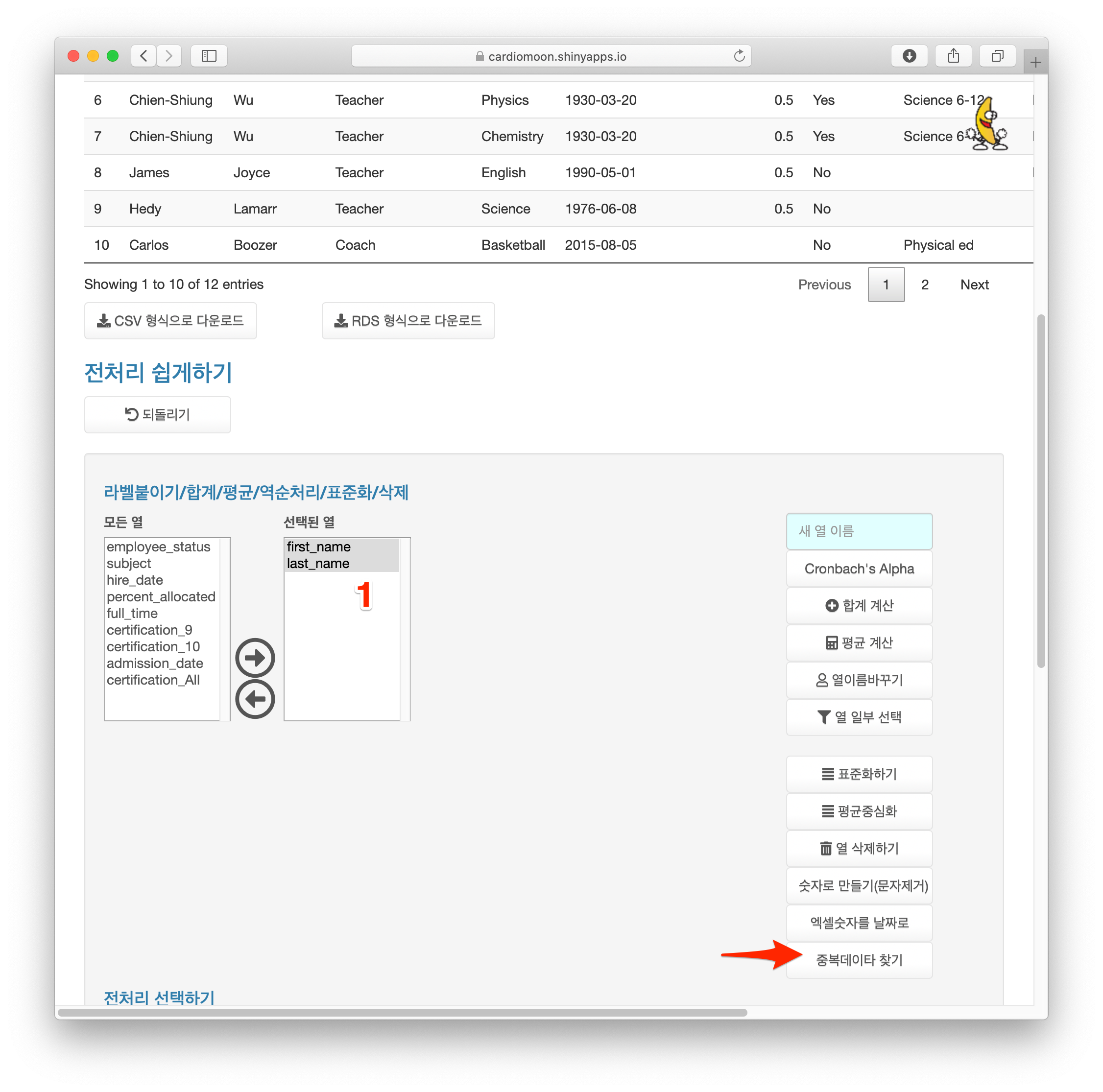 데이터 중 중복된 값을 찾는 것ㅇ은 매우 간단하다. first_name과 last_name이 같은 데이터를 찾으려면 first_name과 last_name을 선택한 후(1) 중복데이터 찾기를 누르면 된다(화살표). 중복데이터를 찾은후 되돌리기를 누르면 다시 전의 상태로 돌아간다.