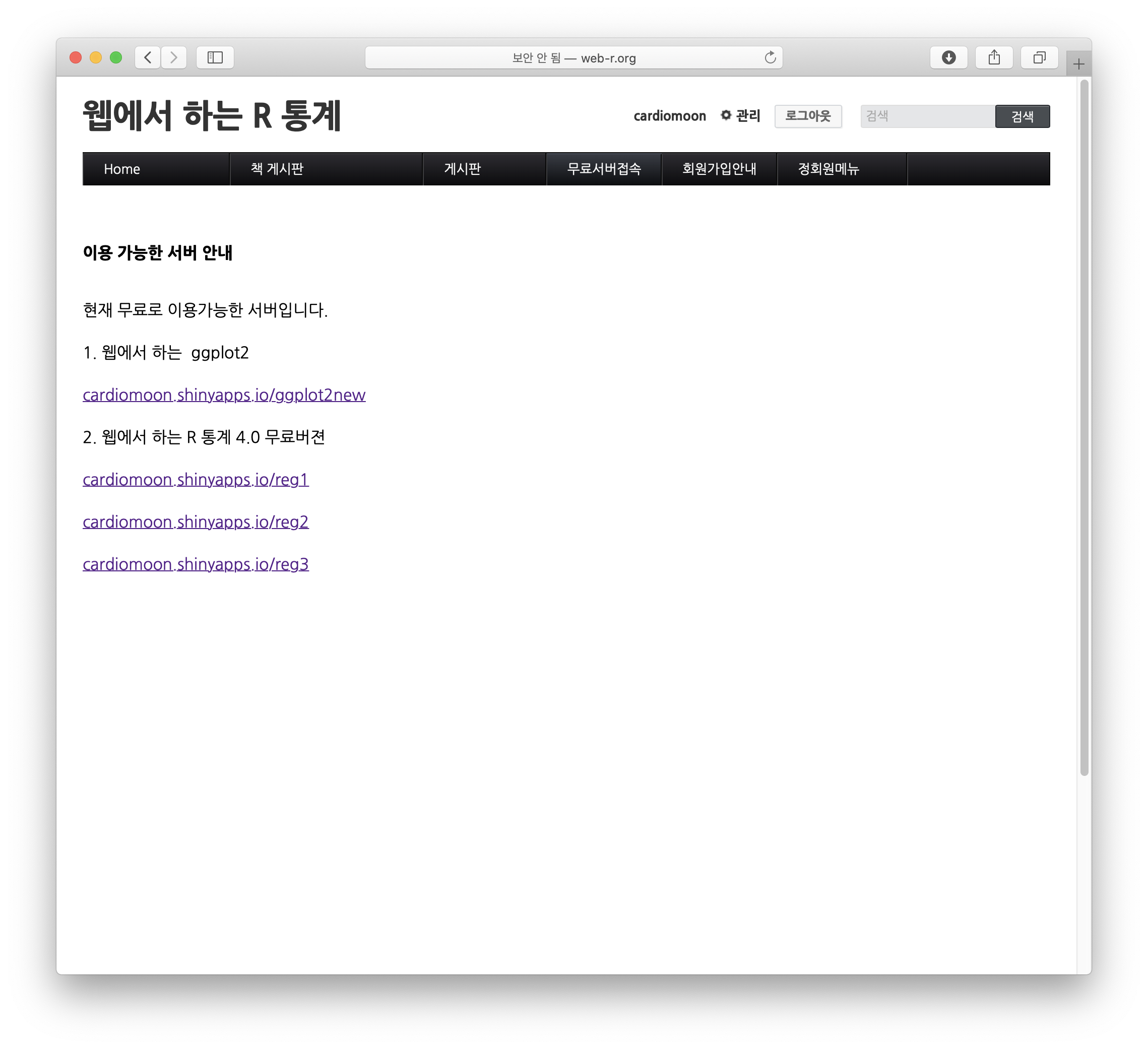 웹R의 가입은 무료이므로 가입 후 로그인을 하면 “무료서버접속” 메뉴에서 무료서버접속을 할 수 있다. 웹에서 하는 R 통계분석 4.0 무료버젼 중 하나를 선택해 클릭한다.