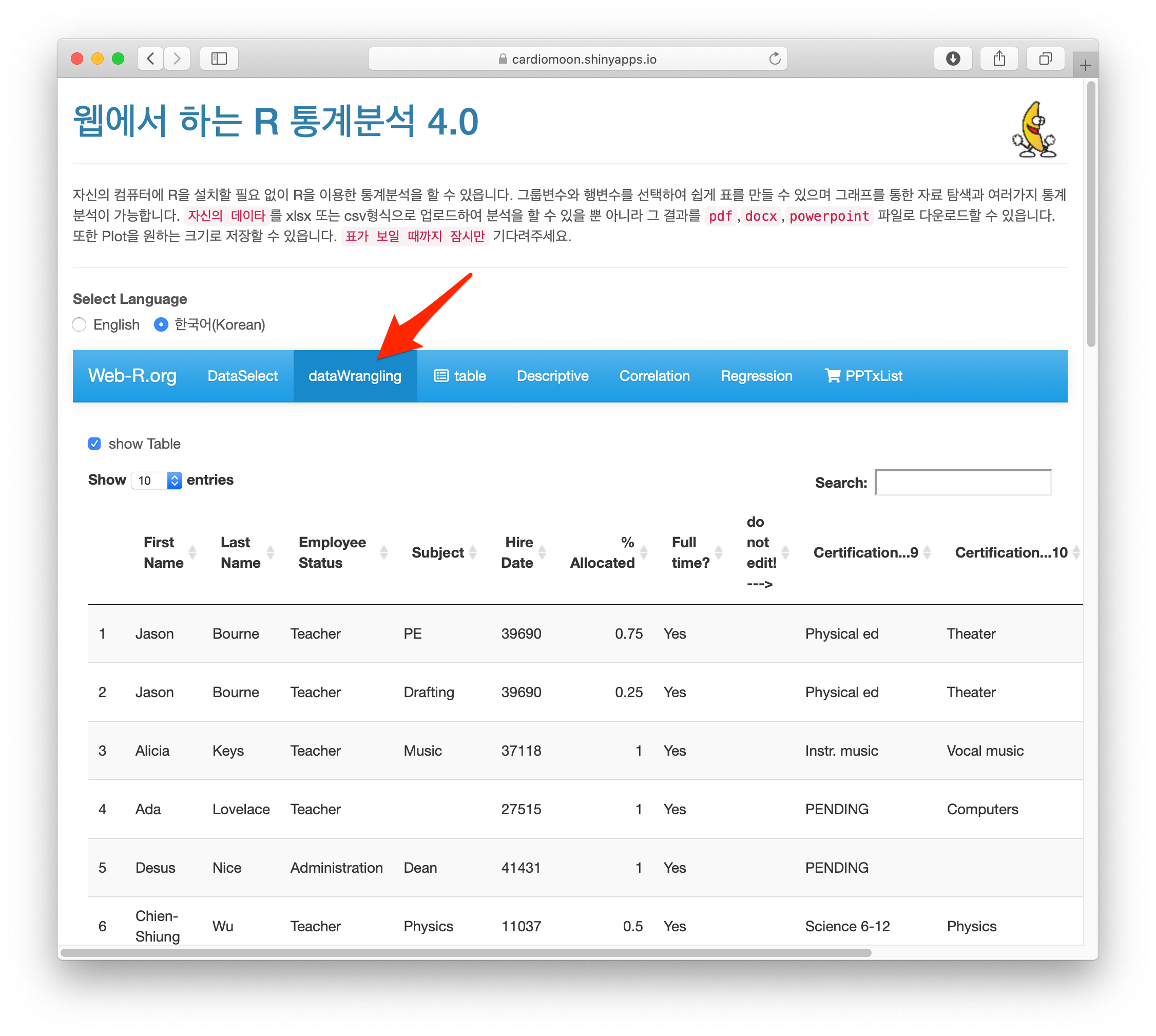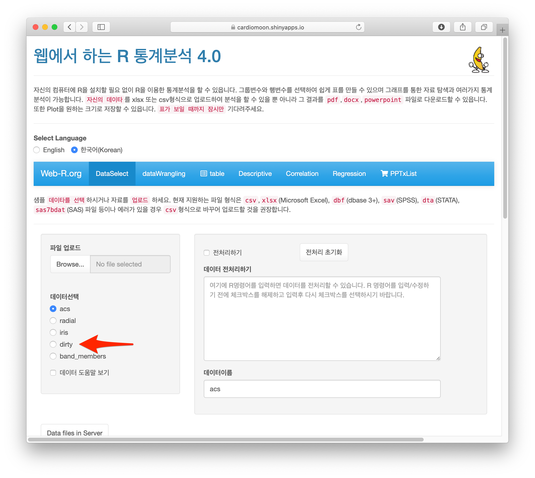 이 데이터를 바로 사용하여 분석을 진행하면 에러가 난다. 먼저 메뉴에서 dataWranging을 선택한다.