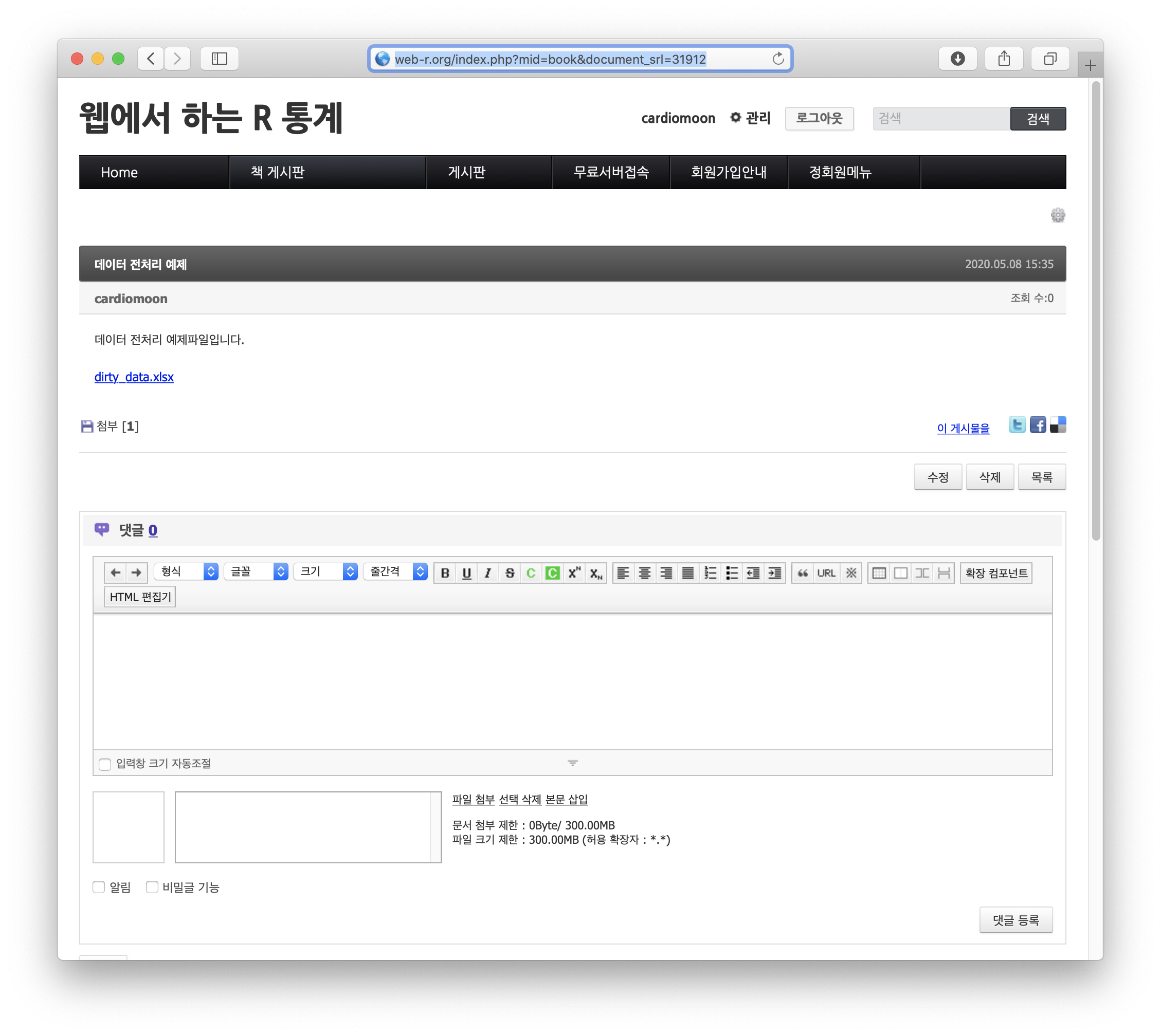 다음 주소에서 데이터 전처리에 쓰일 파일을 다운로드 받는다. 다운로드 받을 파일은 dirty_data.xlsx 로 http://web-r.org/index.php?mid=book&document_srl=31912 에서 다운로드 받을 수 있다.