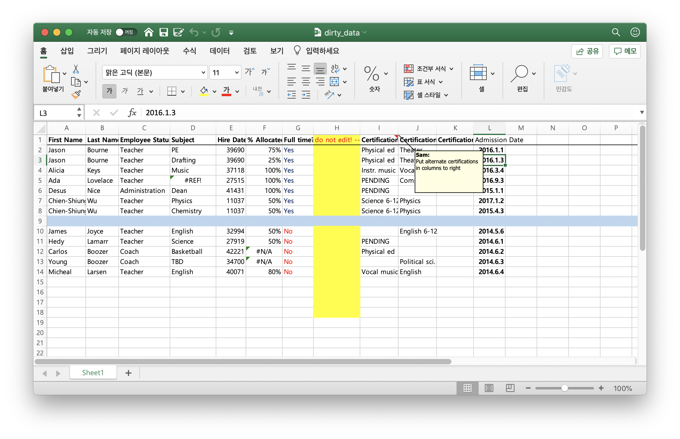 다시 화면을 위로 올려보면 열이름 중 공백이 _글자로 대치되고(예를 들어 first name이 first_name) %는 percent로 바뀌어 있는 것을 알수 있다. 또한 certification이라는 열 이름이 중복이 되어 있었는데 certification_9, certification_10으로 바뀌어 있는 것을 확인할 수 있다.