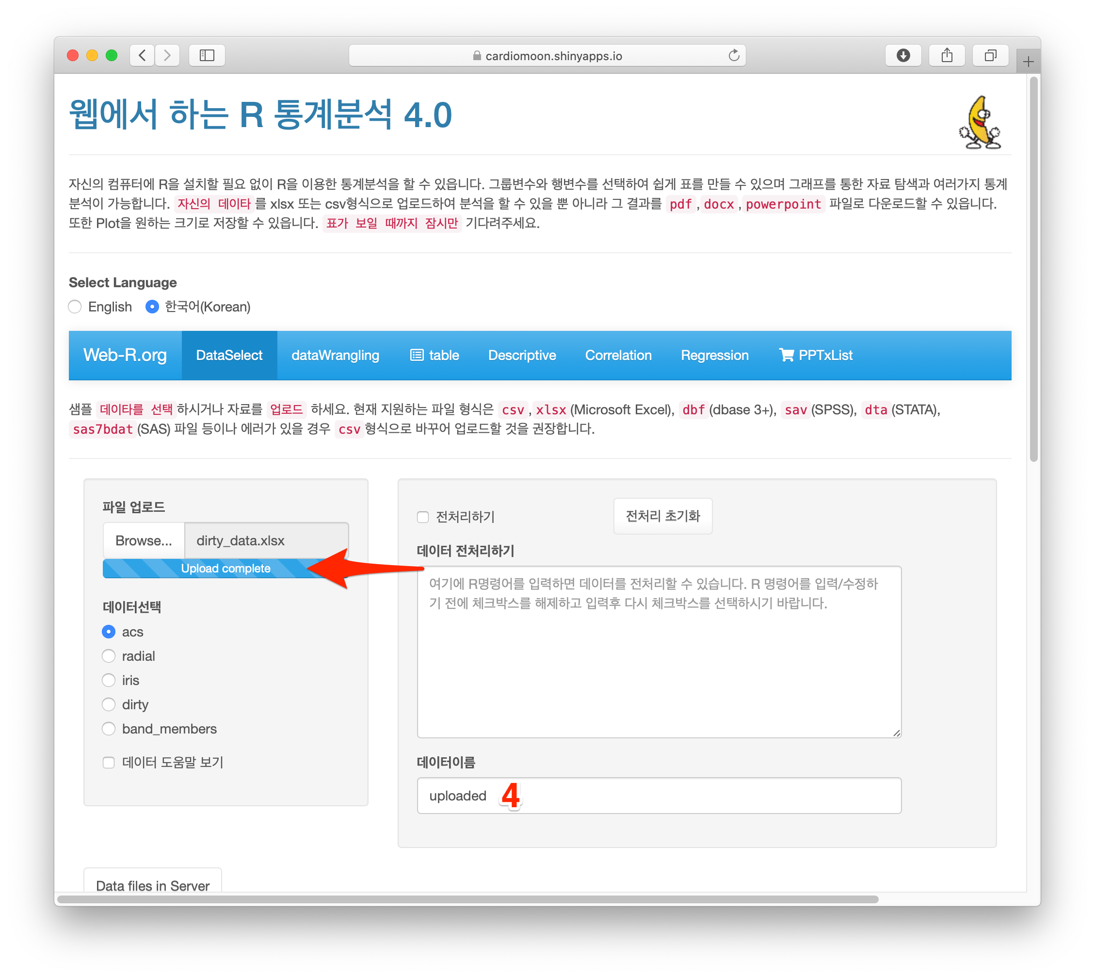 업로드가 되면 “upload complete”메시지가 나타나고(화살표) 데이터이름이 uploaded로 바뀐다(4).