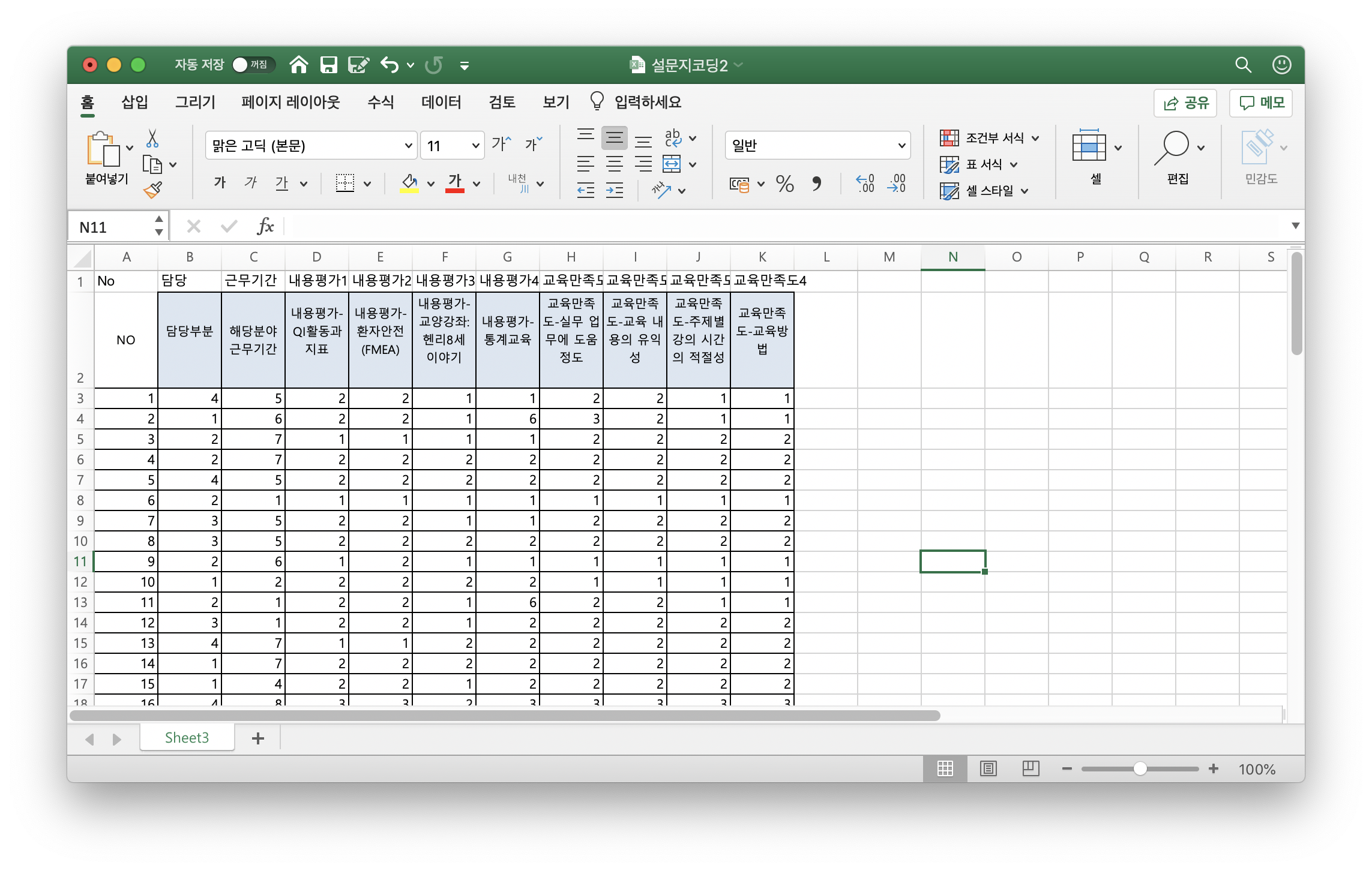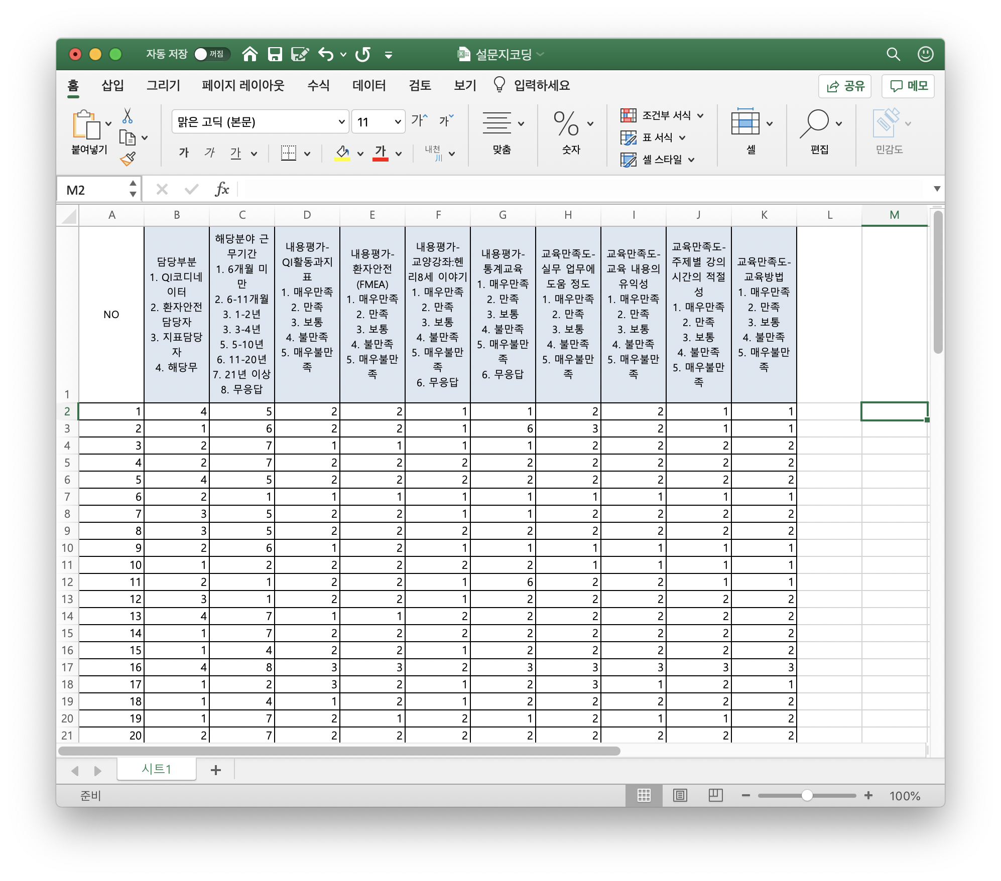 가장 권하고 싶은 방법은 이와 같이 정리를 하는 것이다.열 이름은 짧을수록 좋으며 빈칸이 있으면 안된다. 또한 숫자로 시작하지 않는 것이 좋다. 단어 사이를 띄어쓰기를 하고 싶은 경우 언더바를 사용하는 것이 좋다. (예: 언더_바) 먼저 열이름을 최대한 간단하게 이름 붙이고 두번째 행에 자세한 내용을 적는다. 두번째 행의 내용은 이후 웹R에서 열이름 라벨로 사용된다. 이 자료파일의 이름은 설문지코딩2.xlsx이다.