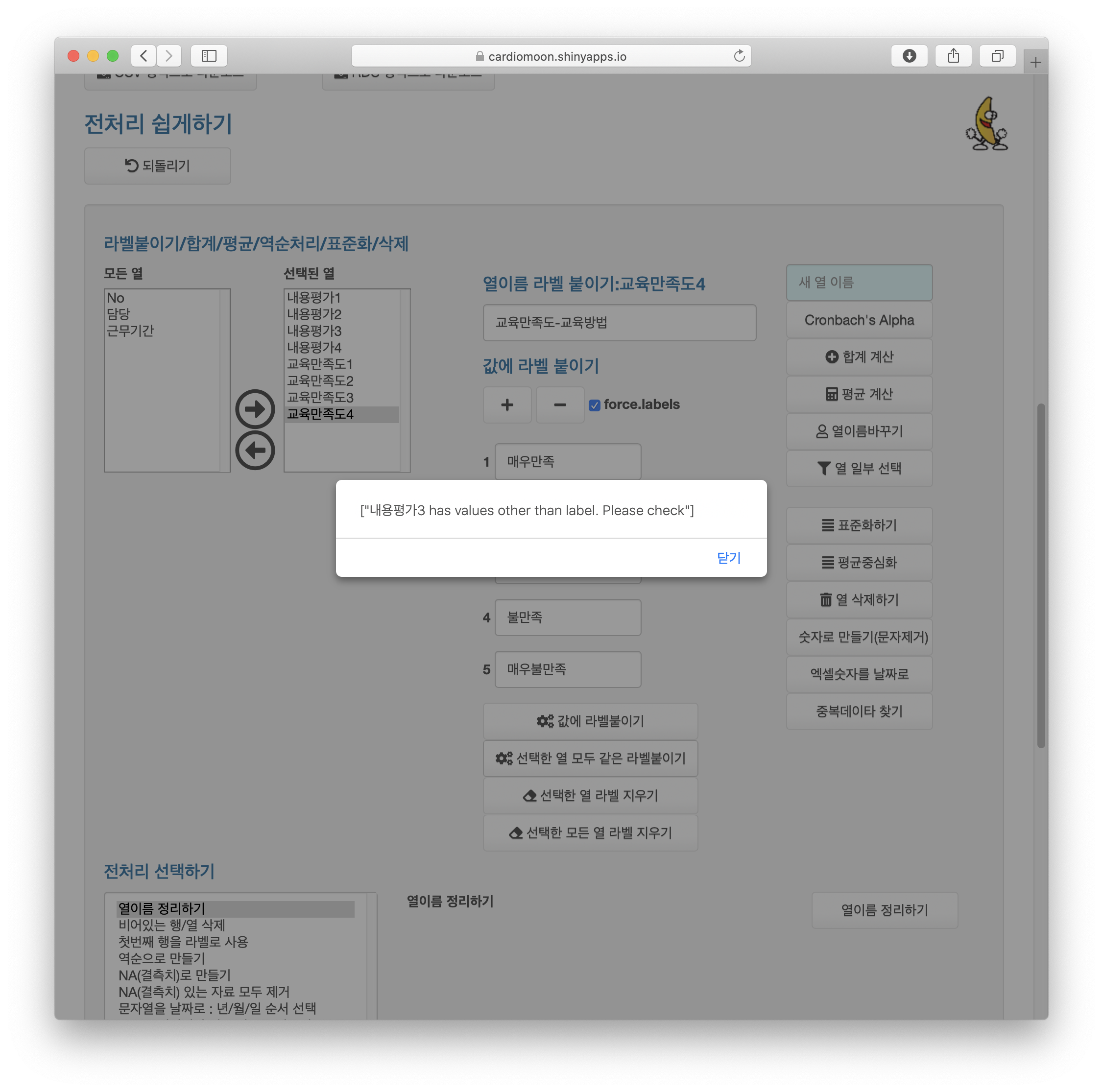 다음과 같은 경고메시지가 나타난다. 내용평가3은 한명이 값을 입력하지 않아 6으로 코딩한 값이 있어 이와 같은 경고메시지가 나타난다. 당황하지 말고 닫기버튼을 누른다.