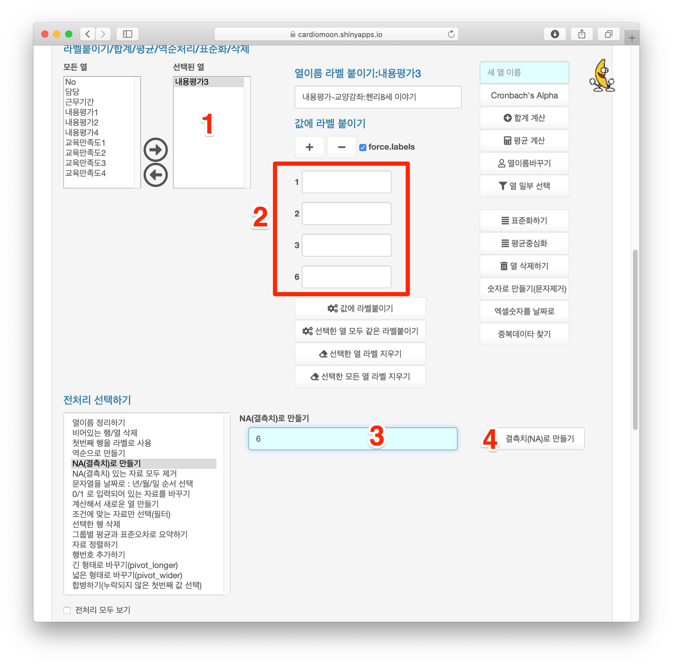 내용평가3을 선택하면(1) 1,2,3,6 이 있는 것이 보인다(2). 이중 6은 결측치이다. 화면 아래쪽에 있는 NA(결측치)로 만들기를 선택하고 6을 입력하고(3) 결측치(NA)로 만들기 버튼을 누른다(4).
