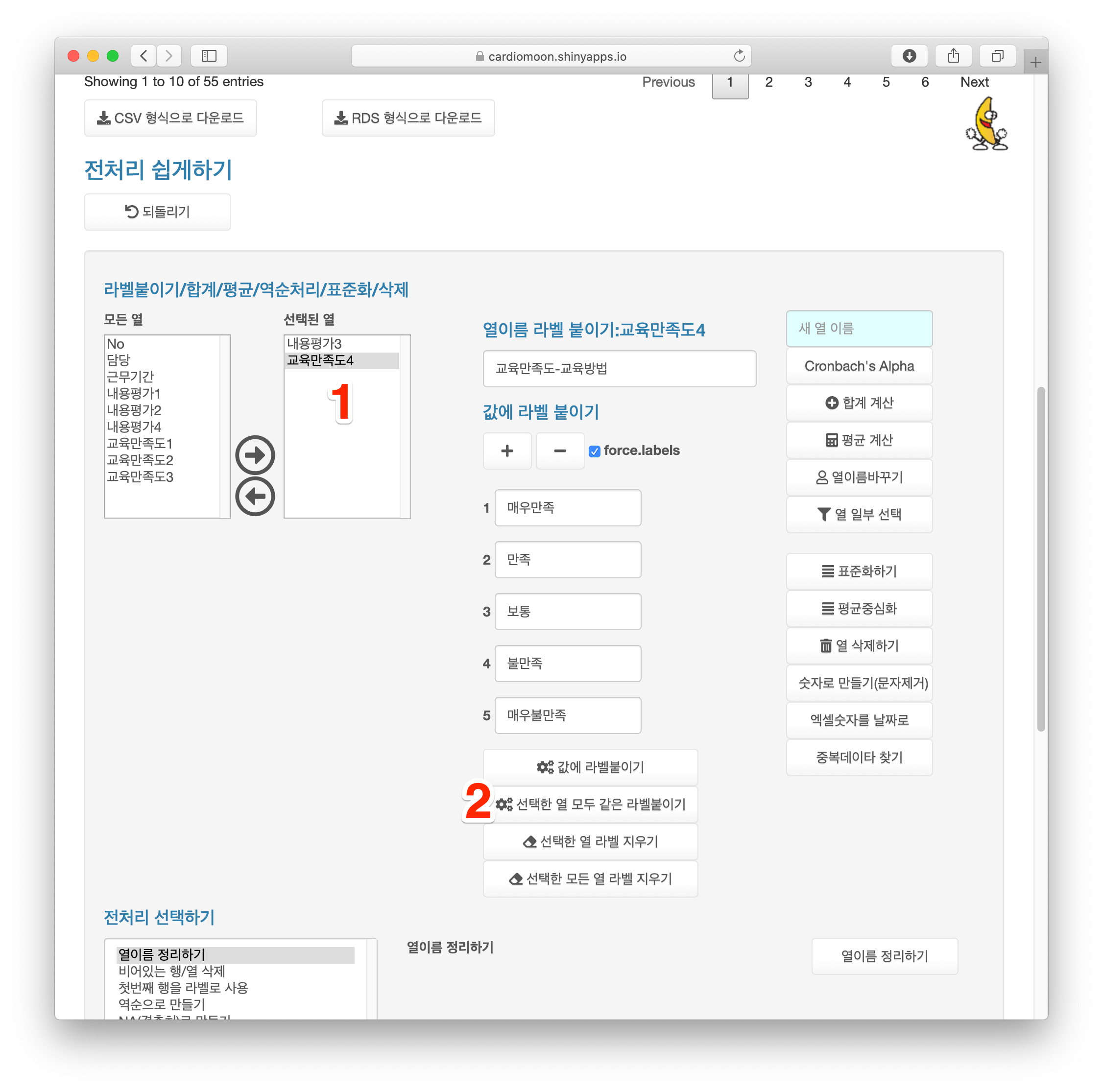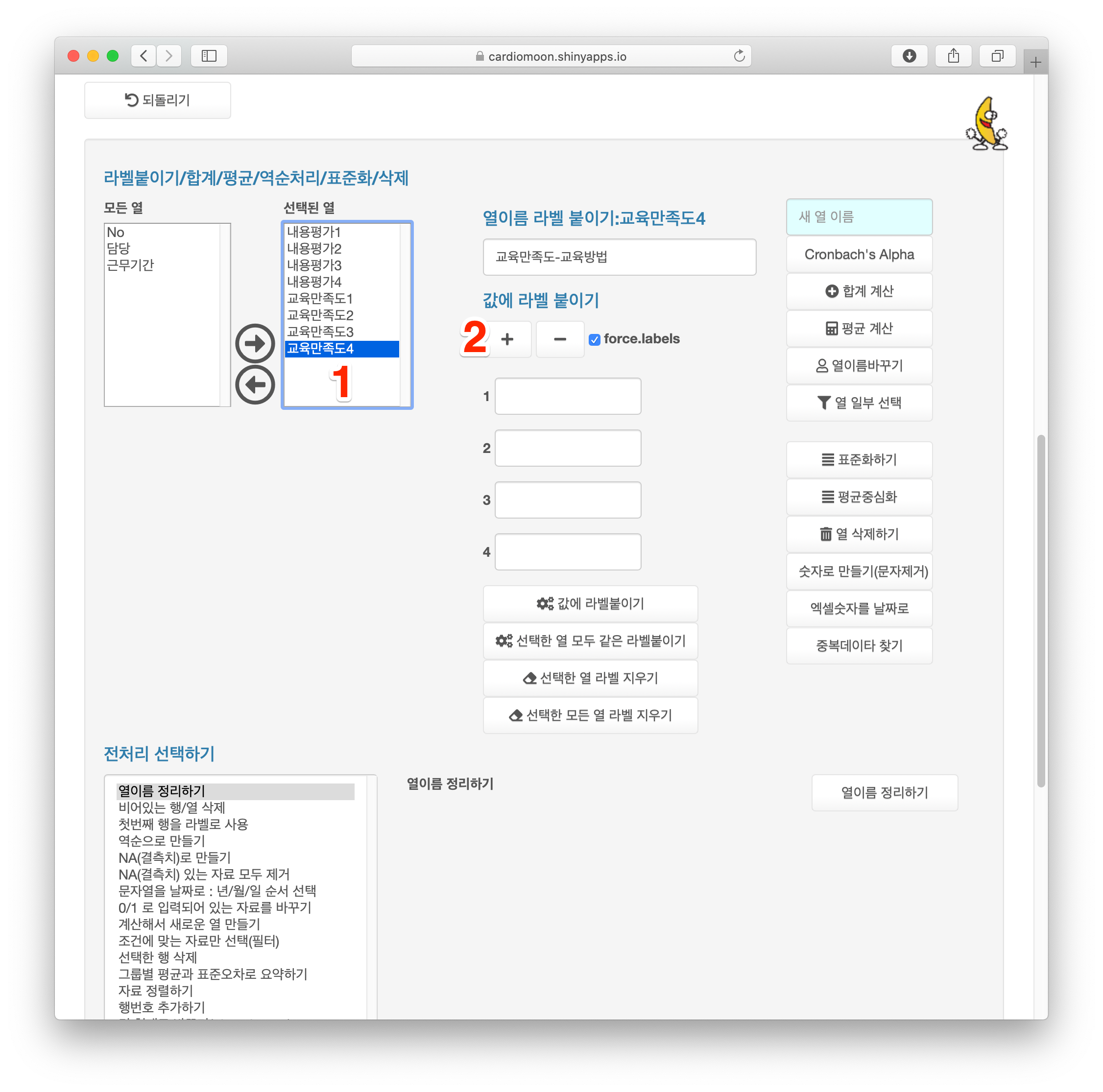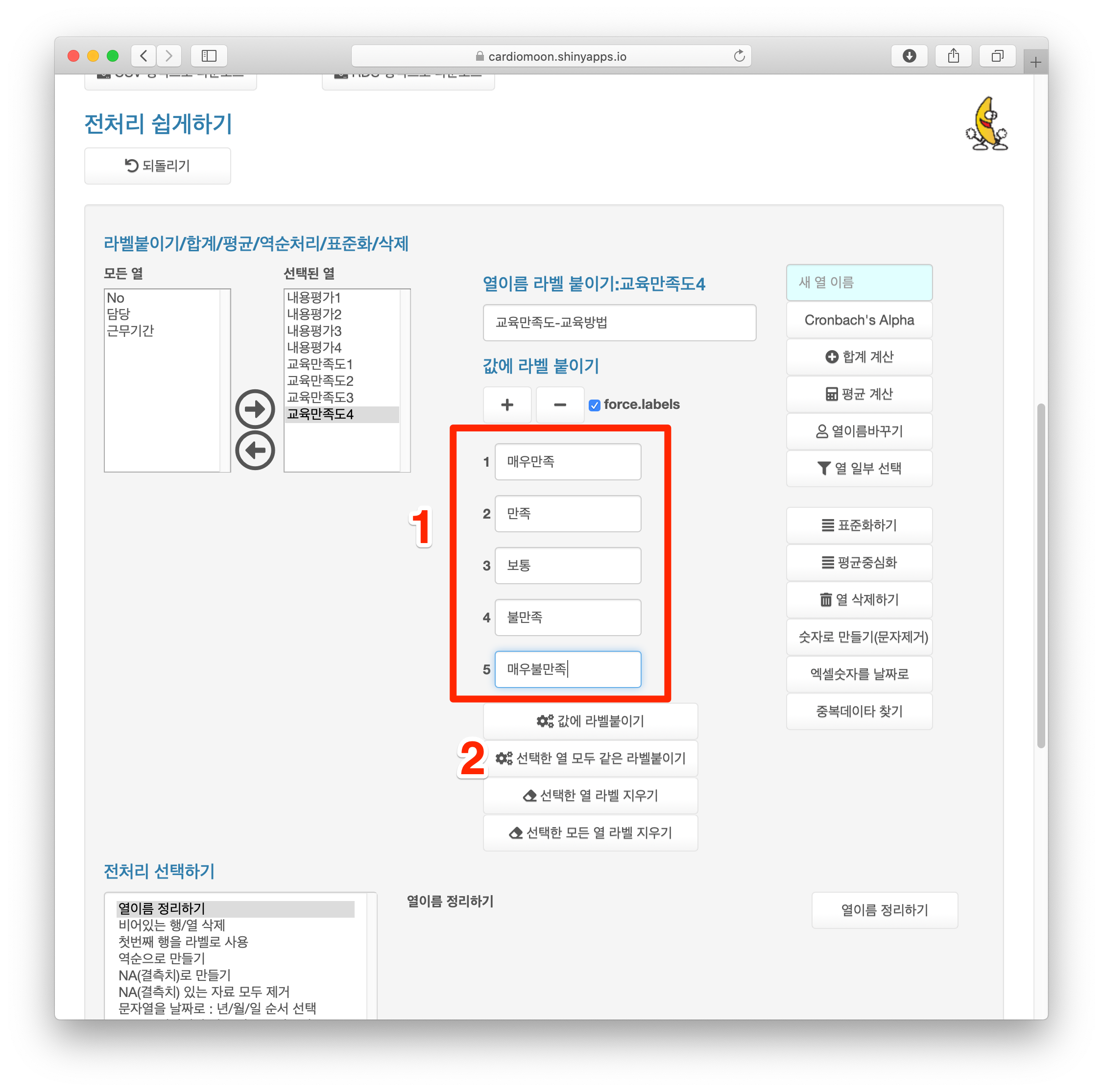 내용평가3에 라벨이 없으므로 내용평가3과 교육만족도4를 선택하고(1) 선택한 열 모두 같은 라벨붙이기 버튼을 누른다(2).