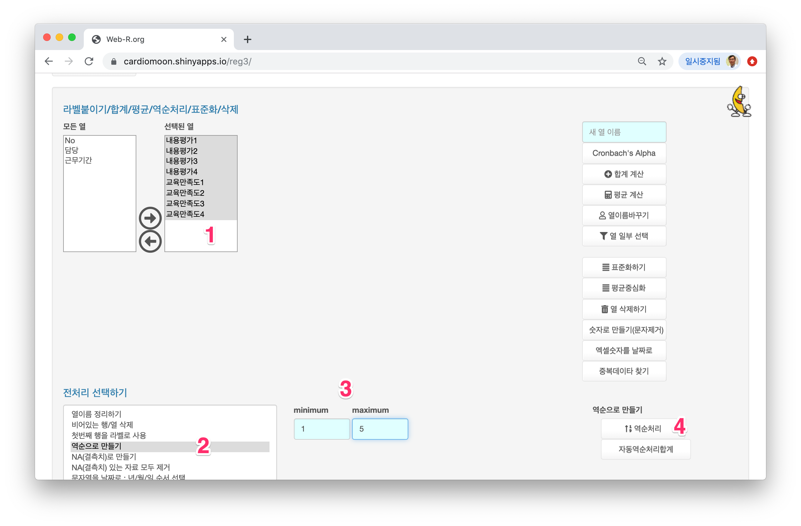 내용평가1-4 와 교육만족도1-4는 모두 매우 만족이 1, 매우 불만족이 5로 코딩되어 있다. 이를 뒤집어 매우 만족이 5, 매우 불만족이 1로 바꾼다면 점수가 높을수록 만족도가 높다는 것을 알수 있을 것이다. 이렇게 항목을 역순으로 만들려면 다음과 같이 한다. 먼저 내용평가1-4, 교육만족도1-4를 모두 선택하고(1) 전처리선택하기 중 역순으로 만들기를 선택한 후(2) minimum에 1, maximum에 5를 입력하고(3) 역순처리 버튼을 누른다(4).