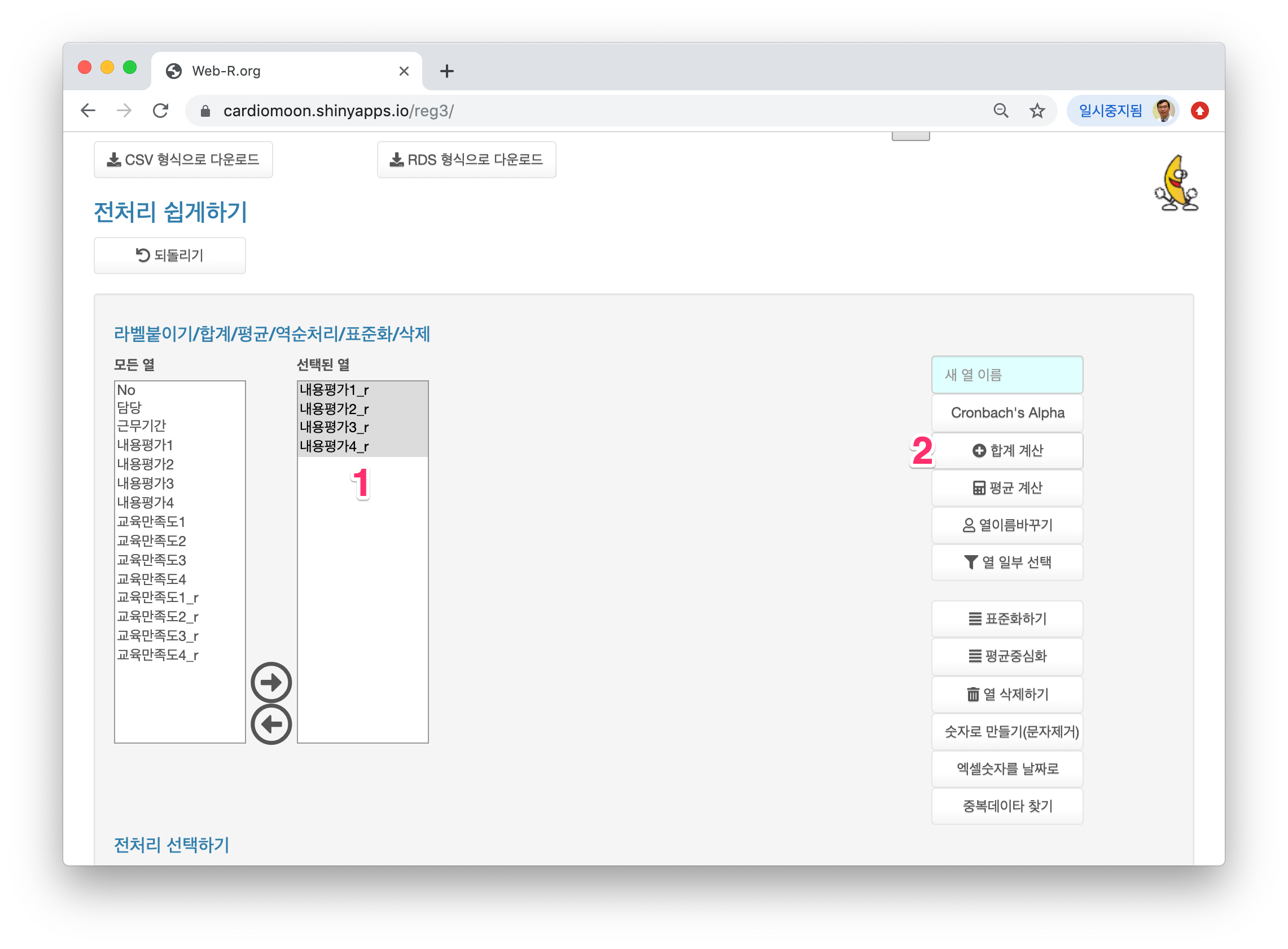 내용평가 및 교육만족도의 합계 및 평균을 구해보자. 먼저 내용평가1_r 부터 내용평가4_r까지 네개의 열을 선택한 후 합계계산 버튼을 누른다(3). 내용평가합계 열이 새로 만들어지며 여기에 합계가 기록된다.