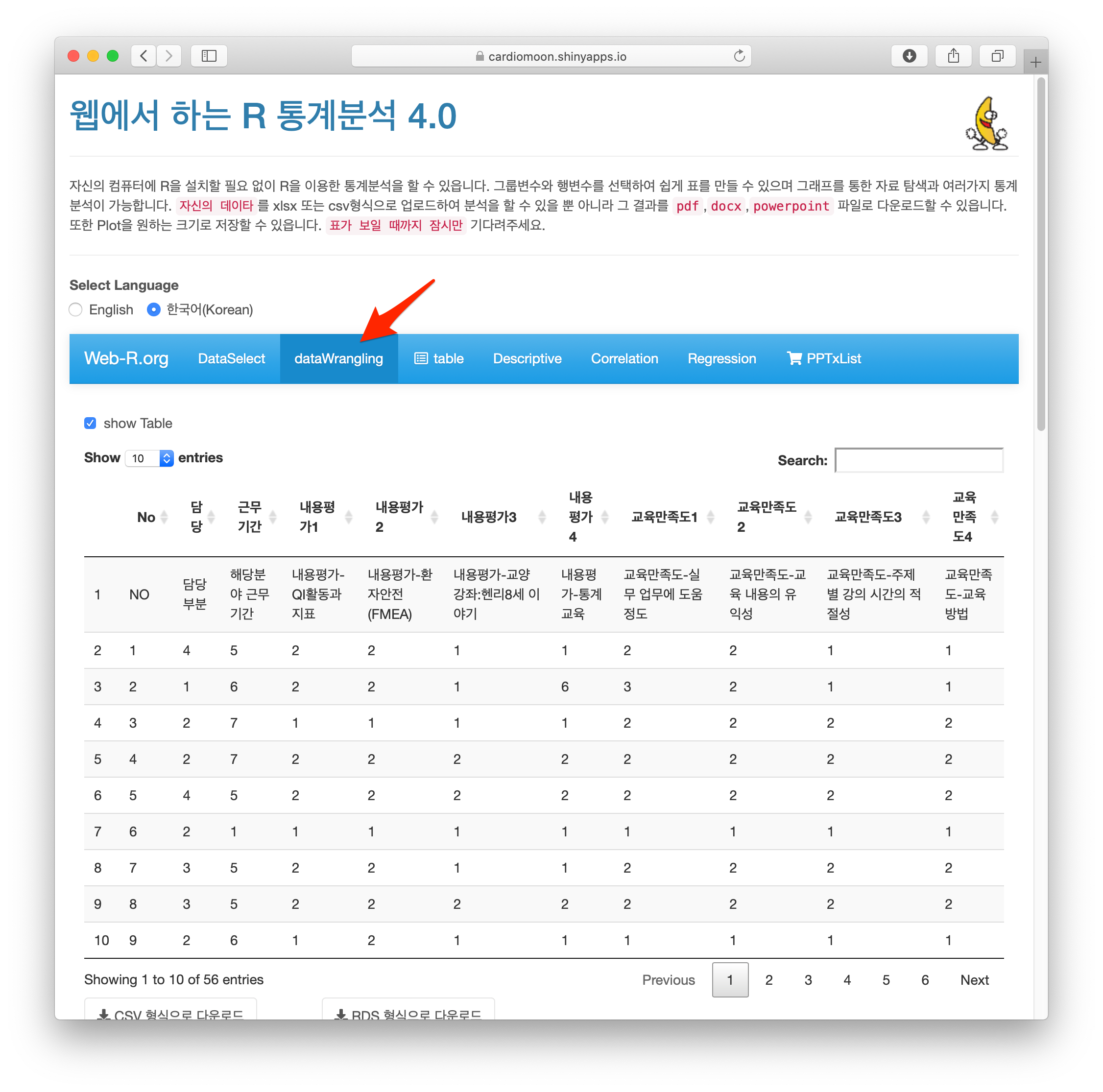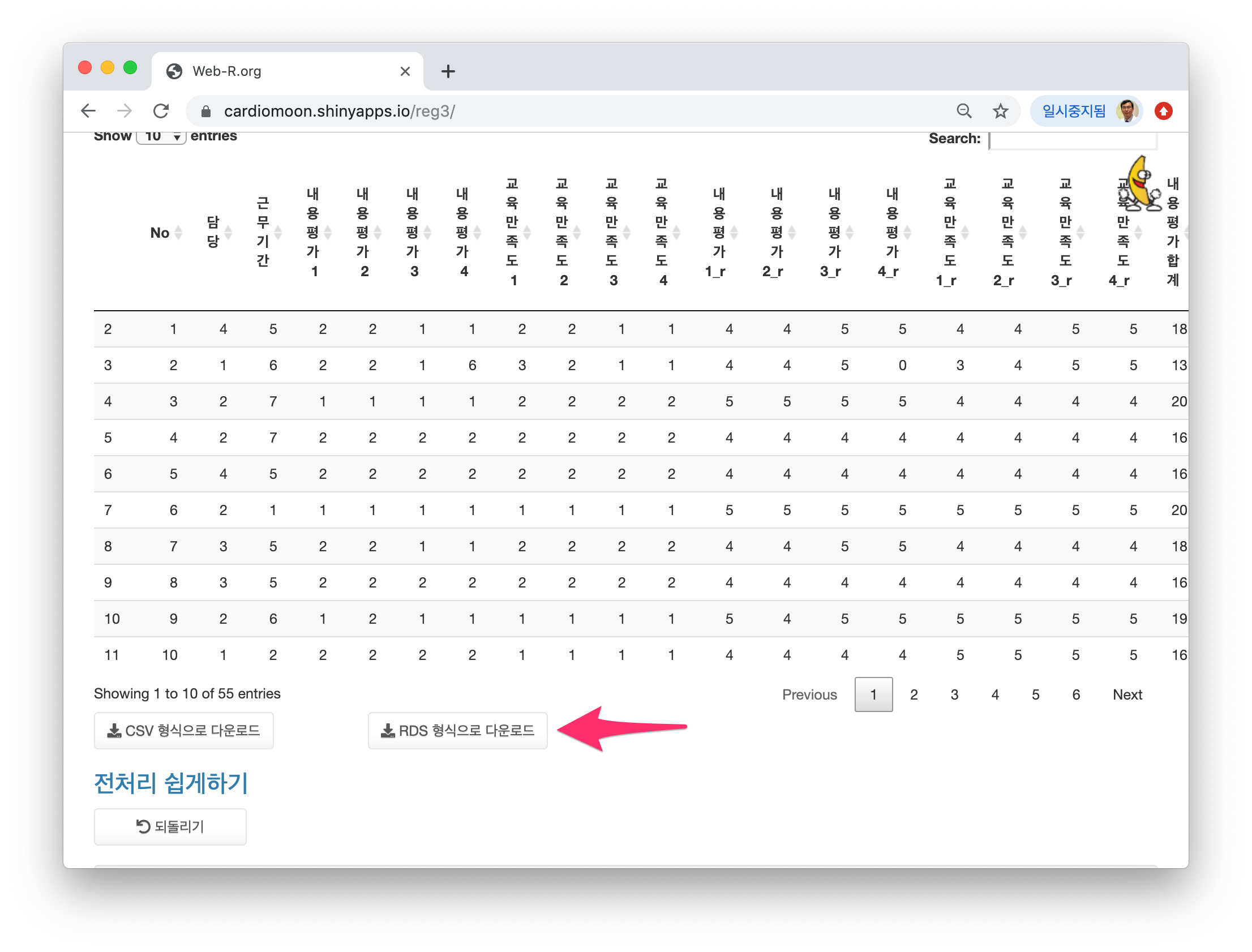 위와 같은 과정을 거쳐 전처리를 한 후 전처리된 자료를 다운로드하여 저장하면 다음에 이 자료를 이용하여 분석할 때 다시 전처리를 할 필요가 없다. 화면을 위로 이동한 후 RDS 형식으로 다운로드 버튼을 누른다. RDS형식으로 저장하면 전처리 과정에서 붙인 라벨 등이 그대로 유지된다. csv형식으로 저장하는 경우 라벨등이 없어지며 날짜 형식의 자료도 문자형으로 바뀌니 주의하여야 한다.