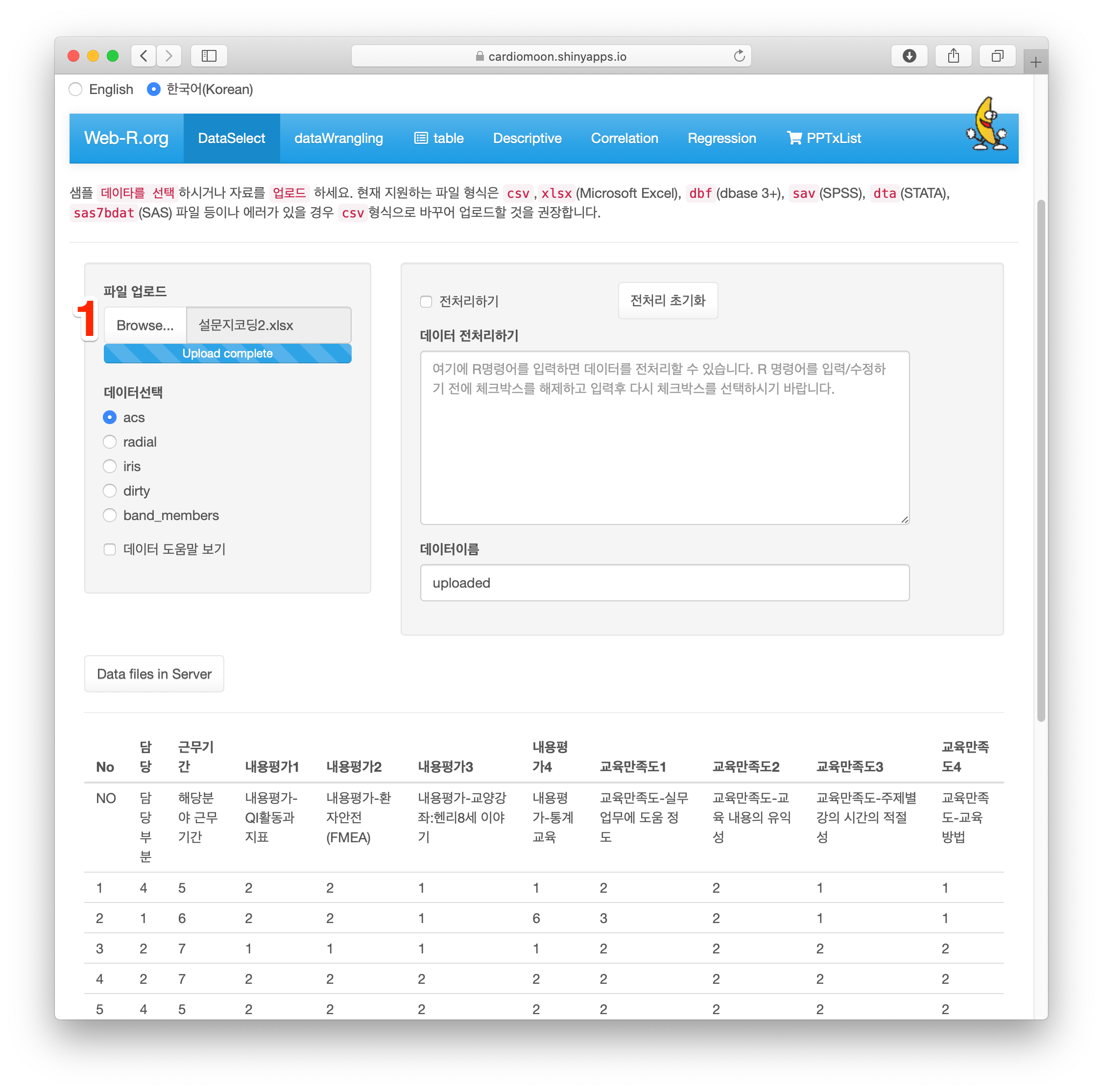 웹R에 접속한 후 무료서버접속 페이지를 통해 무료서버에 접속한다. 파일 업로드를 위해 Browse… 버튼을 누르고(1) 다운로드 받은 “설문지코딩2.xlsx” 파일을 업로드한다.