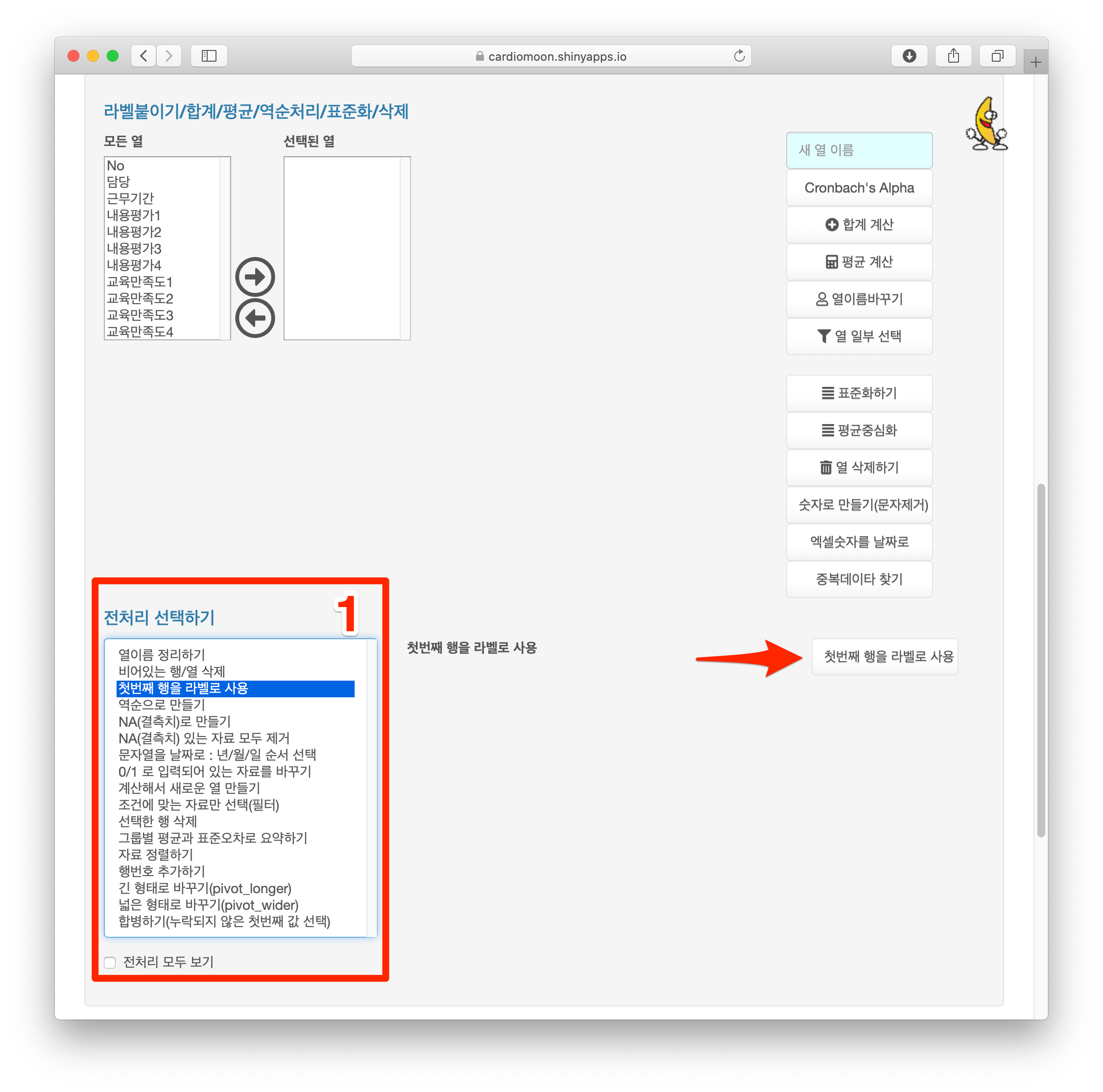 화면을 아래쪽으로 이동하여 “전처리 선택하기” 중 “첫번째 행을 라벨로 사용”을 선택하고(1) “첫번째 행을 라벨로 사용”버튼을 누른다(화살표).