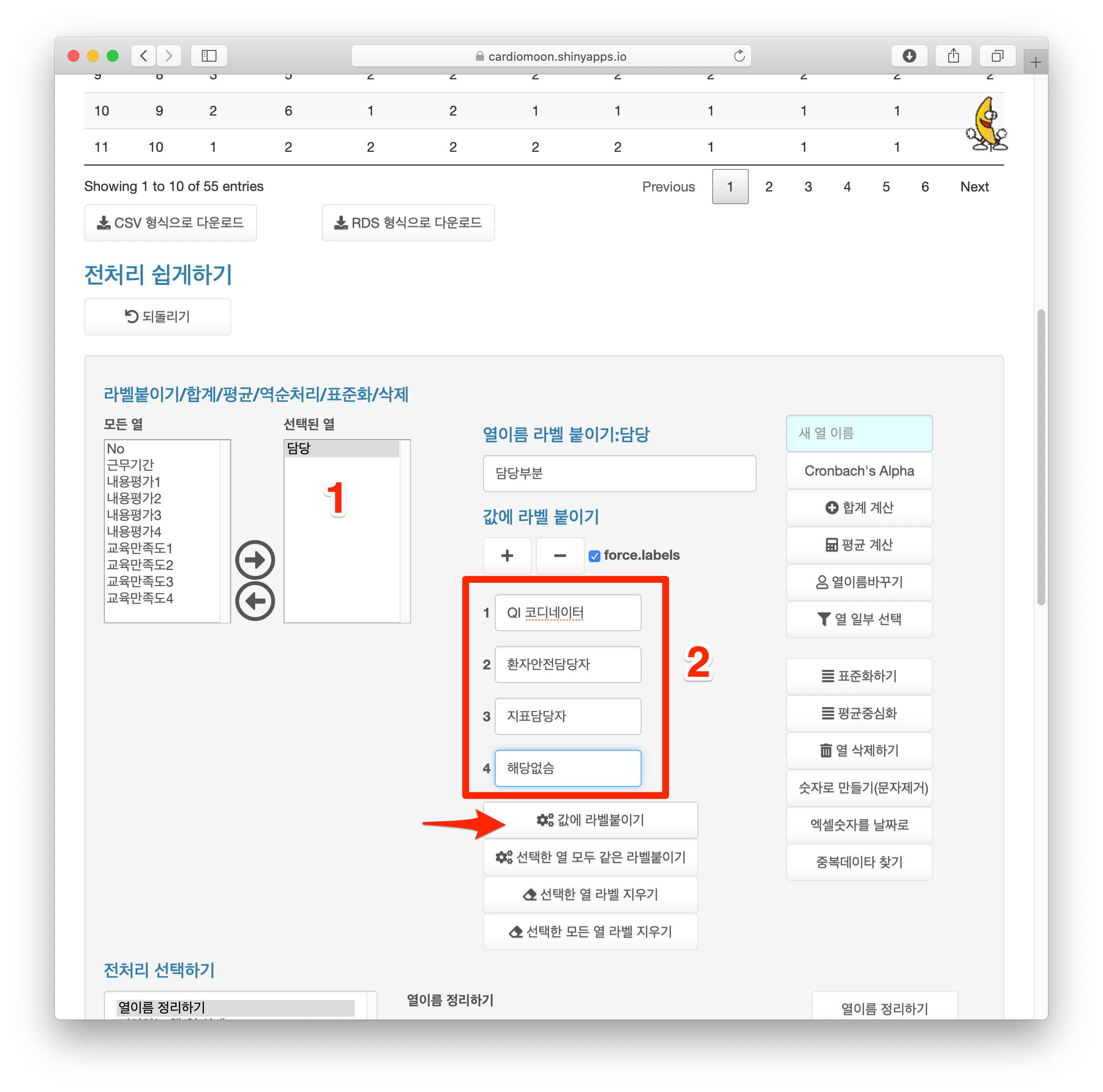 라벨붙이기/합계/평균/역순처리/표준화/삭제에서 담당 열을 선택한 후(1) 라벨을 입력하고(2) 값에 라벨붙이기 버튼(화살표)을 누른다.