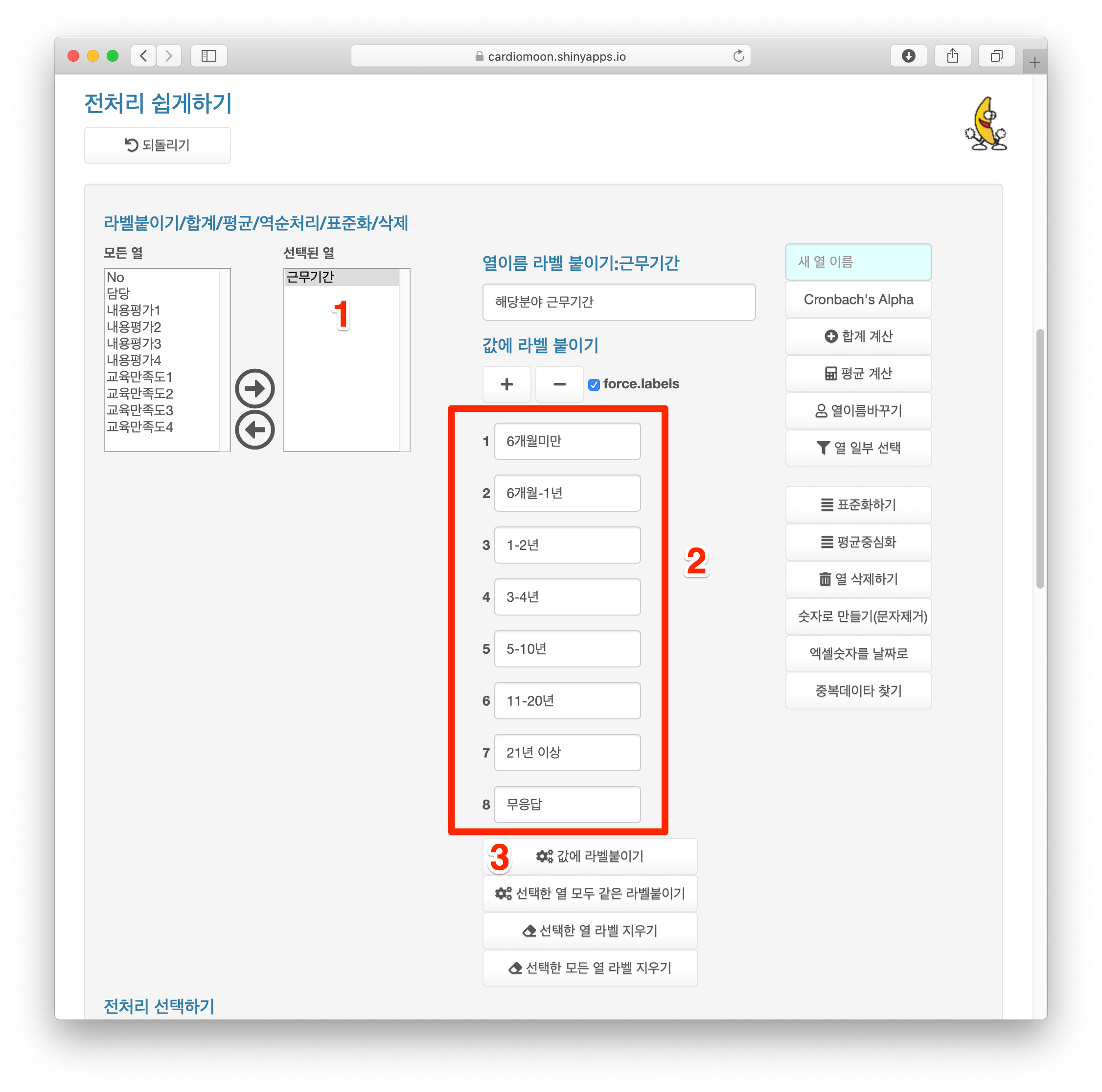 계속해서 1-5단계까지 라벨을 입력하고(1) 선택한 열 모두 같은 라벨붙이기 버튼을 누른다(2).