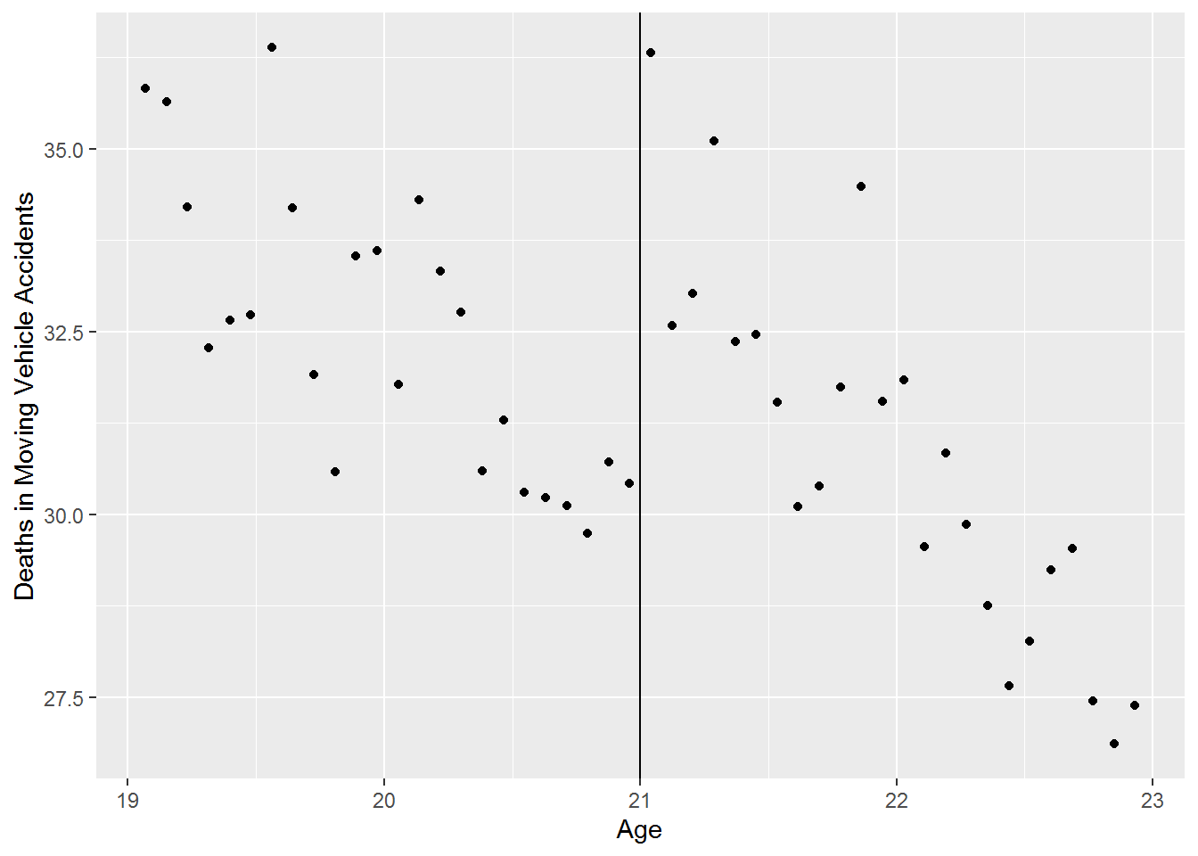 Let’s estimate an RD model using the data from a 2009 paper by Carpenter and Dobkin about the effect of increasing the drinking age on mortality rates.33. Let’s just look at motor vehicle deaths as a function of age.