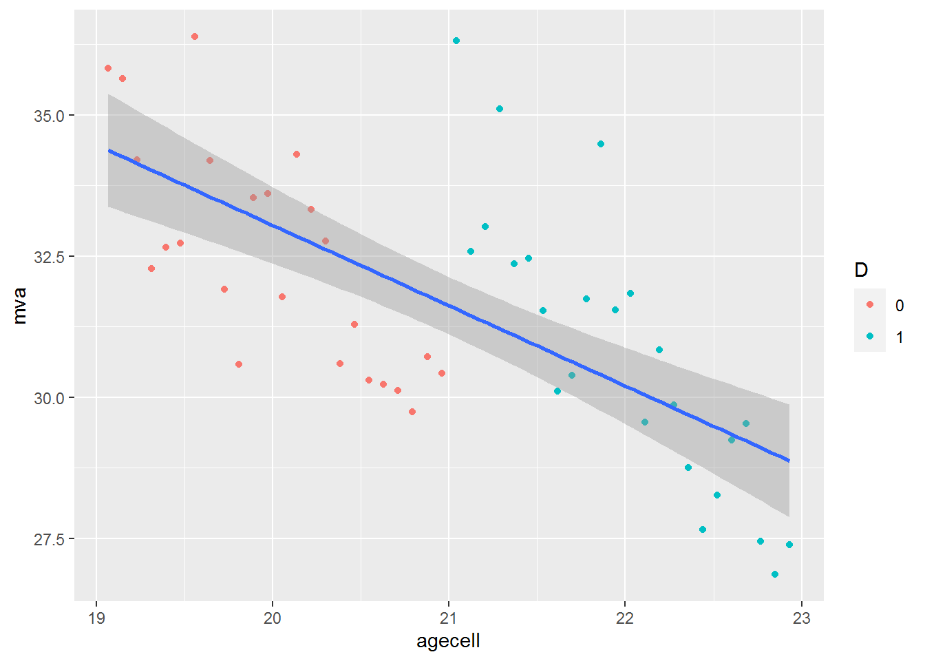 Let’s estimate the relationship described above with a varying slopes RD model. The model now has the form: \[mva = \beta_0+\beta_1T+\beta_2(agecell-21)+\beta_3(agecell-21)T+\epsilon\]