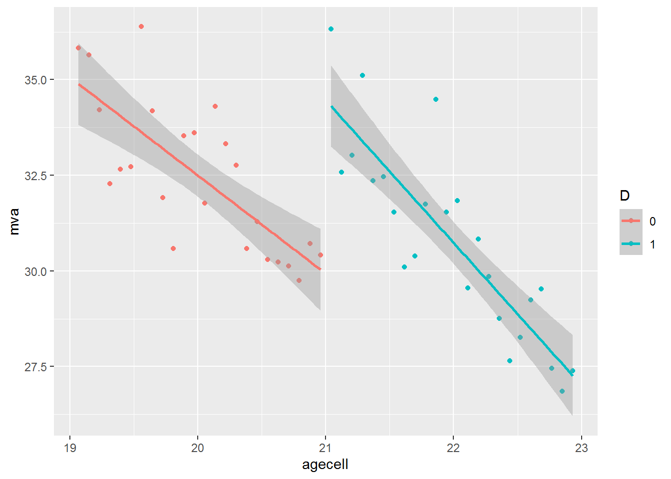 There appears to be a discontinuity at age 21. Let’s estimate the RD model \[mva = \beta_0+\beta_1T+\beta_2(agecell-21)+\epsilon\]