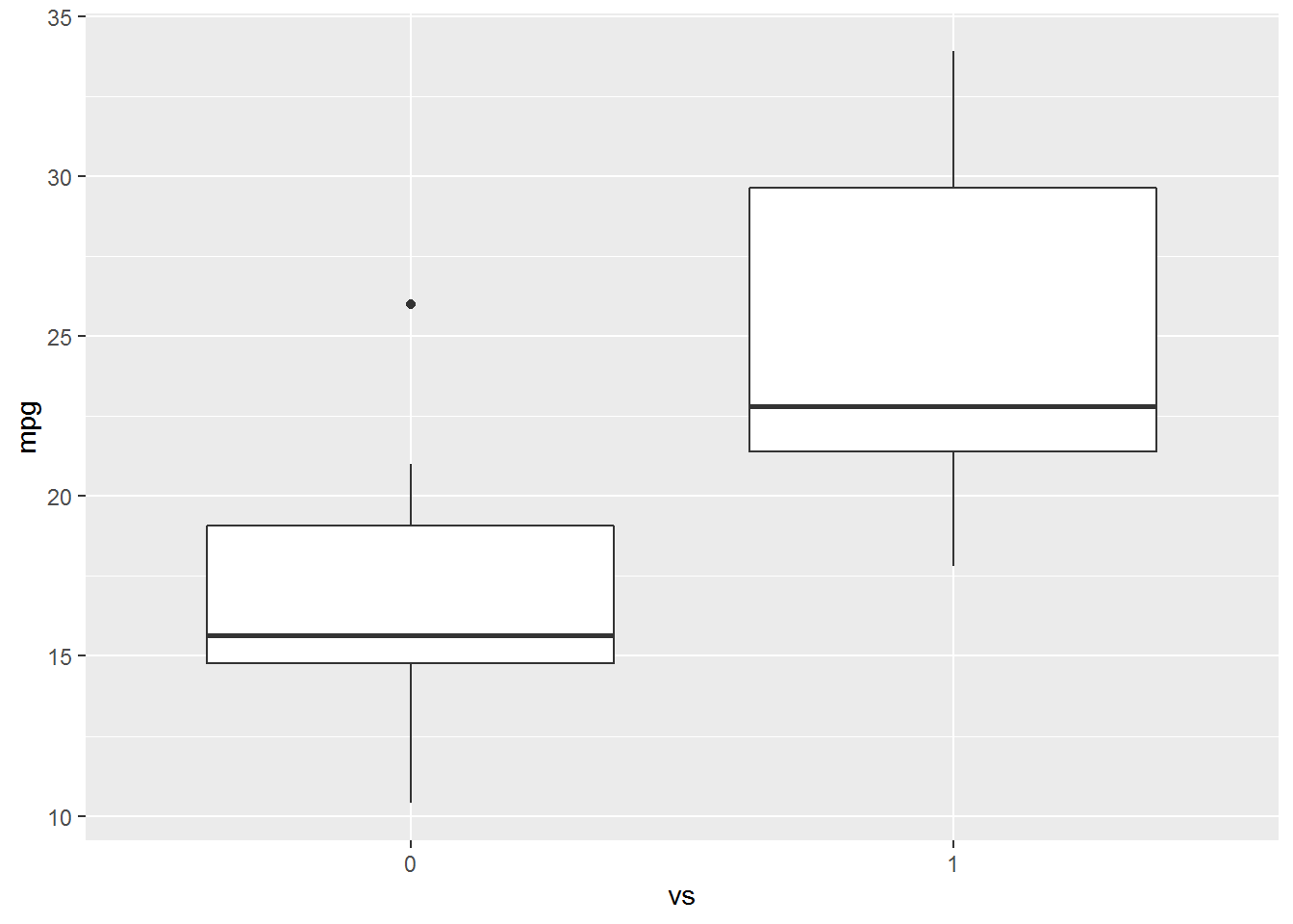 The boxplot indicates that there is difference in mpg between straight vs v-shaped engines. Note the difference in the code between the two similar calls. We need to treat vs as a factor in the boxplot but not in the scatter diagram.