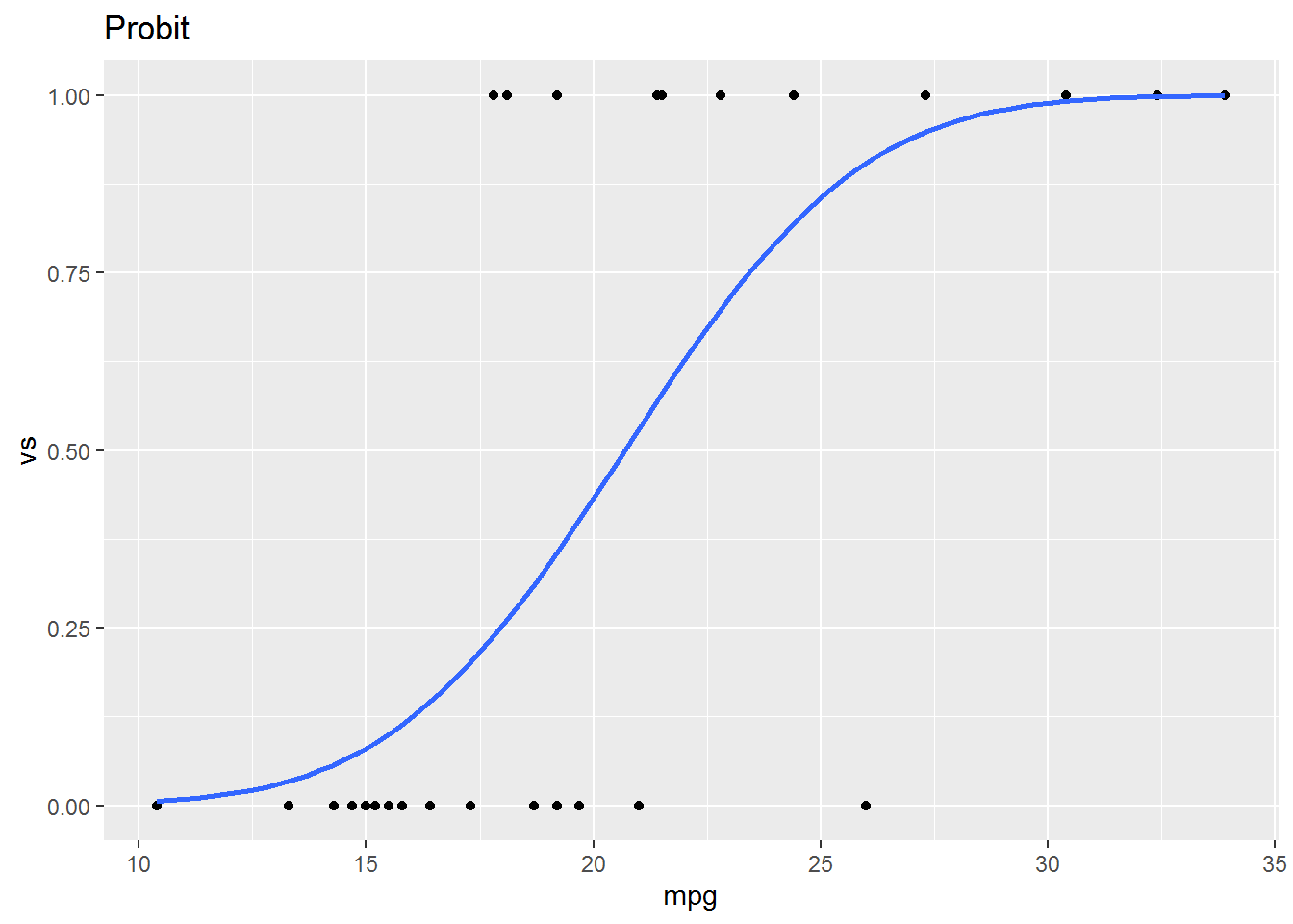 The probit model is given by \[Pr(Y_i=1)=\Phi(\beta_0+\beta_1X_{1i})\] where \(\Phi()\) is the standard normal CDF. Let’s make use of the mtcars36 data set to estimate a probit model to determine engine type as a function of mpg. Engine type, vs, is coded as 0 for V-shaped and 1 for straight.