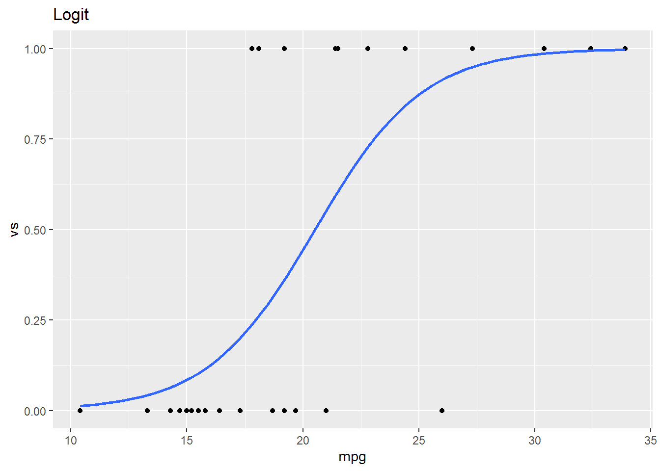 Suppose we’d like to know the probability that a vehicle with automatic transmission that gets 25 mpg has a straight engine. Calculate the odds ratio as \(\ln(\frac{p_1}{1-p_i})=-12.7051+0.6809*25-3.0073*0 = 4.9474\). Exponentiate both sides and solve for p. \(e^{\ln(\frac{p_i}{1-p_i})} = e^{4.9474}\). We know that an exponentiated natural log is just itself so we have \(\frac{p_i}{1-p_i}=140.808\). Solving for p yields \(p_i=\frac{140.808}{141.808}=.9925\). The probability we are looking for is 99.25%. So, \(\hat p=\frac{e^{\hat\beta_0+\hat\beta_1X_1}}{1 + e^{\hat\beta_0+\hat\beta_1X_1}}\).
