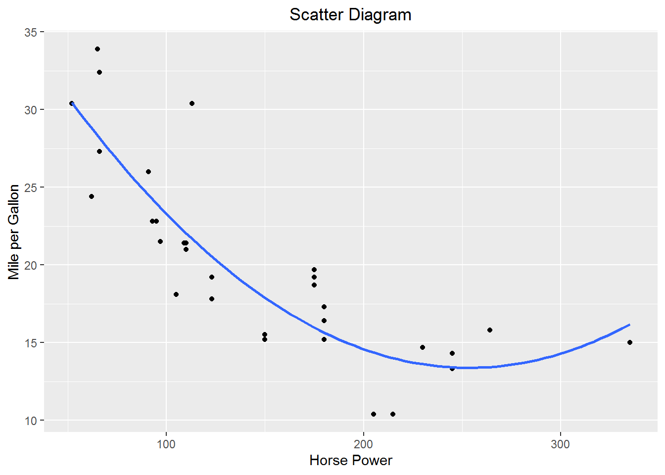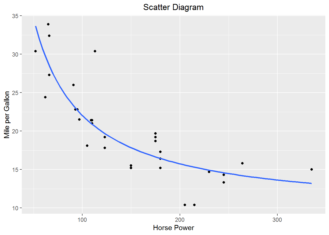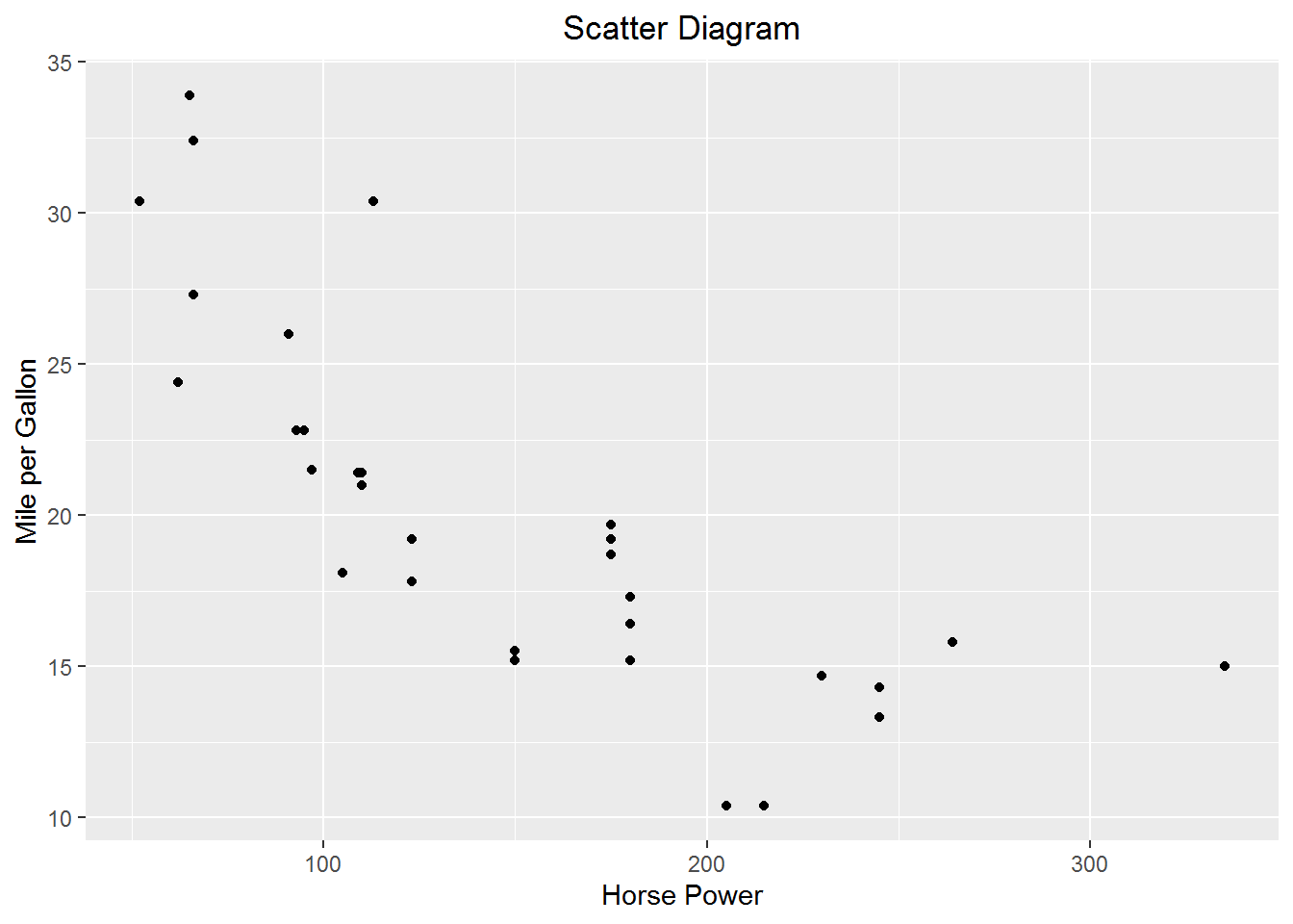 labs(y = "Mile per Gallon", x = "Horse Power", title = "Scatter Diagram") +