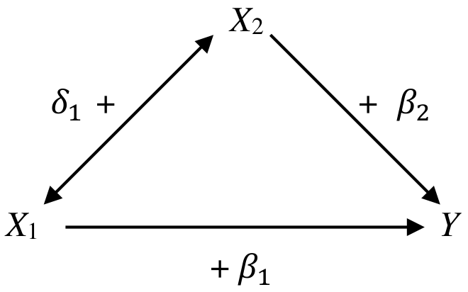 按圖所示,當 \(X_2\) 保持不變,\(X_1\) 與因變量 \(Y\) 正相關 (\(\beta_1>0\))。但是,兩個預測變量之間 \(X_1, X_2\) 也呈正相關關係 \(\delta_1 >0\)。而同時,\(X_2\) 的升高會導致因變量 \(Y\) 的下降 ($_2 <0 $)。這種情況就意味著,如果,我們不調整 \(X_2\) (使之保持不變),那麼 \(X_1\) 每升高一個單位,\(Y\) 的變化會低於調整 \(X_2\) 時,\(X_1\) 的變化所引起的 \(Y\) 的變化。如果這時候 \(\beta_2,\delta_1\) 較大,那麼對於 \(X_1\) 來說,調整 \(X_2\) 前後,回歸係數的變化較大,如果大到一定程度,甚至調整前後的回歸係數的方向 (正負) 都會發生變化。