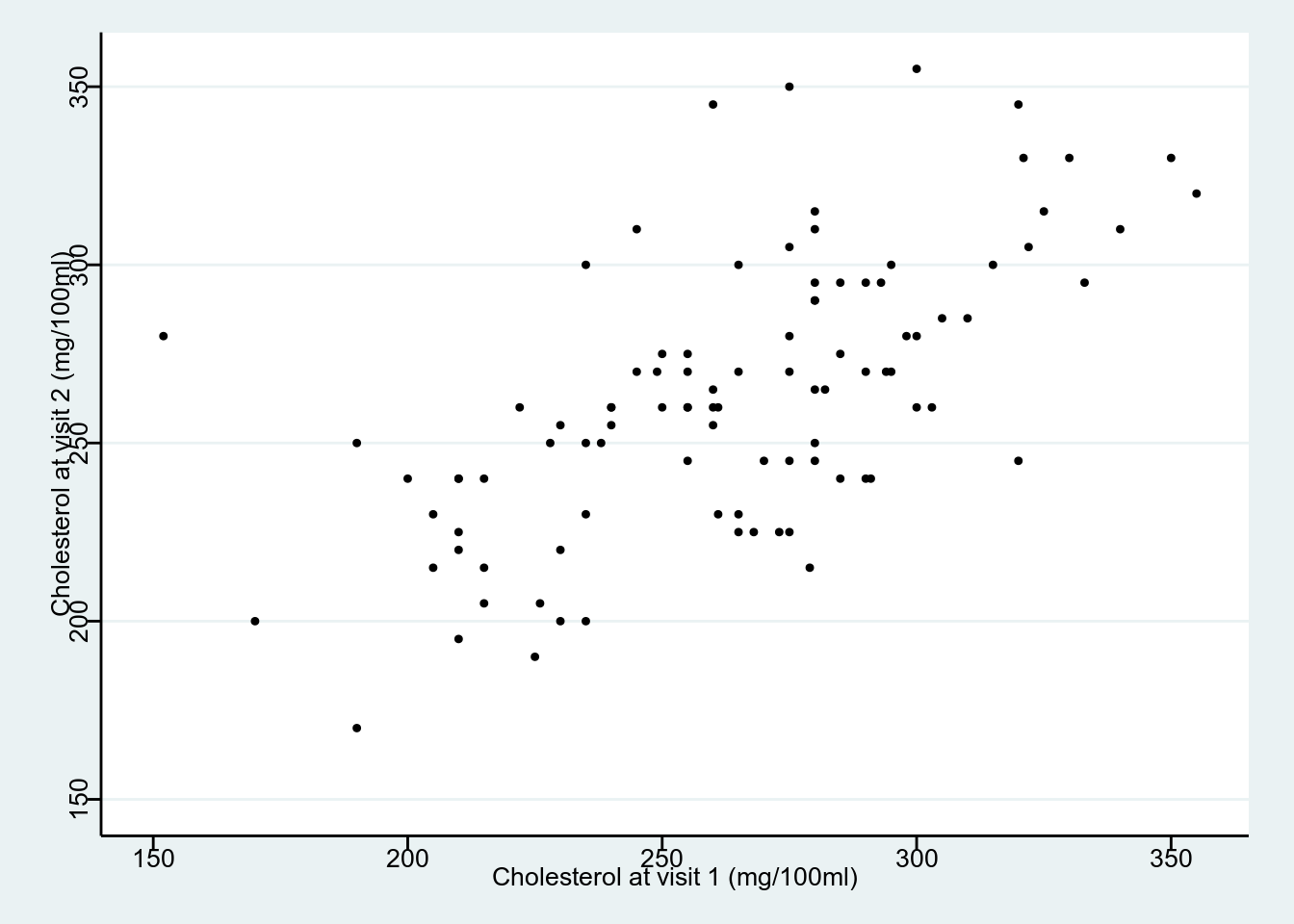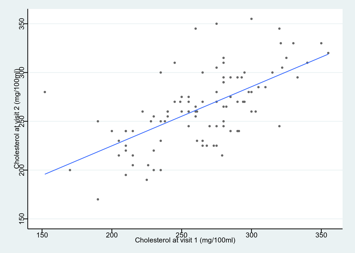 theme_stata() +labs(x = "Cholesterol at visit 1 (mg/100ml)", y = "Cholesterol at visit 2 (mg/100ml)")