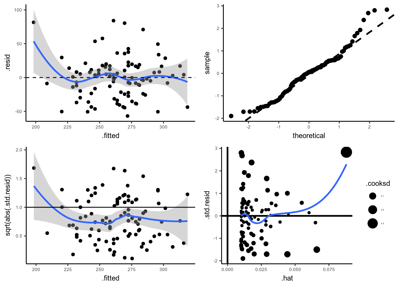 好心人在 github 上共享了 Check_assumption.R 的代碼,可以使用 ggplot2 來獲取高逼格的模型診斷圖: