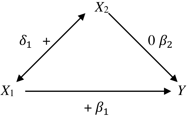 按圖所示,當 \(X_2\) 保持不變,\(X_1\) 與因變量 \(Y\) 正相關 (\(\beta_1>0\))。但是,兩個預測變量之間 \(X_1, X_2\) 也呈正相關關係 \(\delta_1 >0\)。而同時,\(X_2\) 的升高會導致因變量 \(Y\) 的下降 ($_2 <0 $)。這種情況就意味著,如果,我們不調整 \(X_2\) (使之保持不變),那麼 \(X_1\) 每升高一個單位,\(Y\) 的變化會低於調整 \(X_2\) 時,\(X_1\) 的變化所引起的 \(Y\) 的變化。如果這時候 \(\beta_2,\delta_1\) 較大,那麼對於 \(X_1\) 來說,調整 \(X_2\) 前後,回歸係數的變化較大,如果大到一定程度,甚至調整前後的回歸係數的方向 (正負) 都會發生變化。