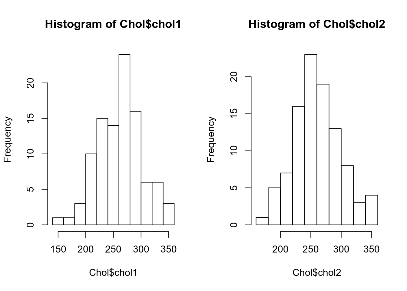 mean(Chol$chol1); mean(Chol$chol2)## [1] 264.6