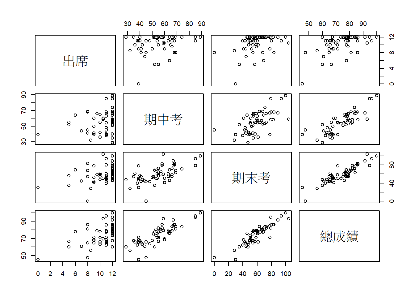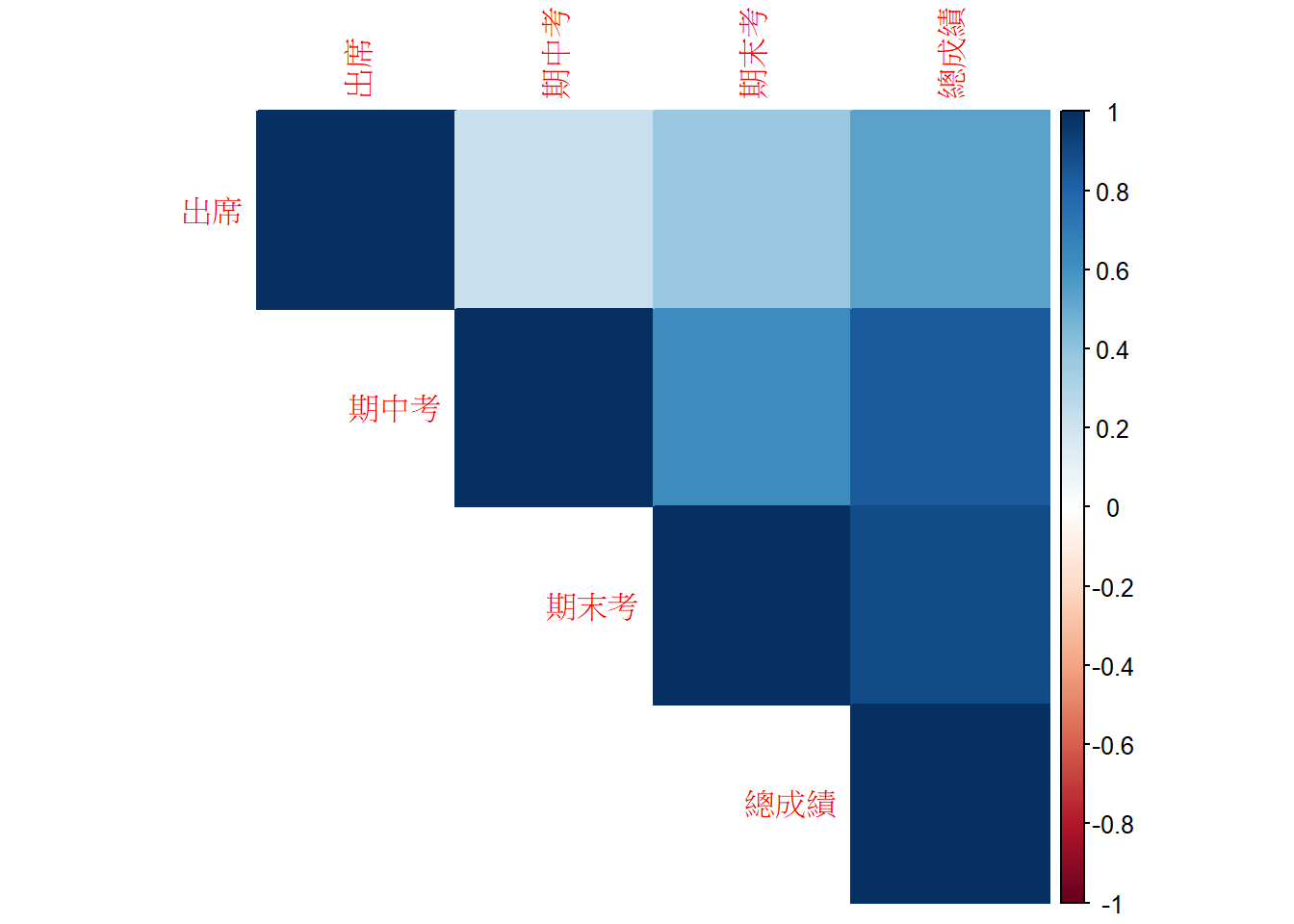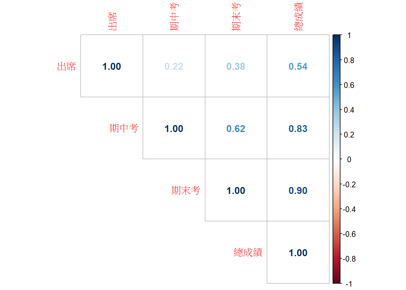 rcorr(data.matrix(gData2))## 出席 期中考 期末考 總成績
