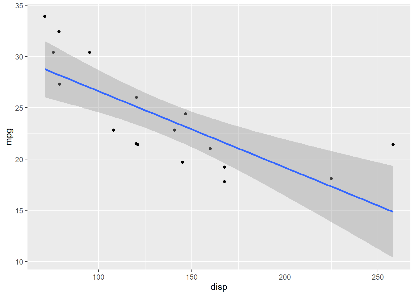 geom_point() + geom_smooth(method = "lm")## `geom_smooth()` using formula 'y ~ x'