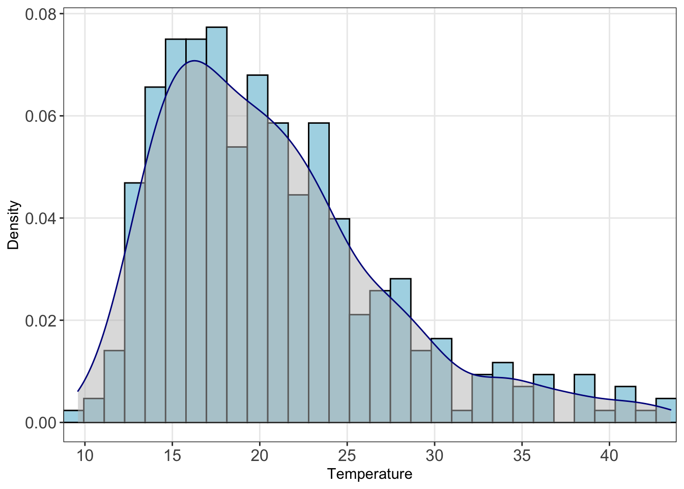 Eyeballing the chart above, there seems to be a correlation between the two data sets. We’ll do one more quick plot to analyse the data. What is the distribution of temperature?